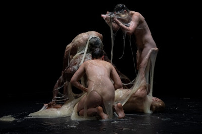 Wien, 15. Oktober 2021. Ein ganz mutiger Besucher hat sich mitten auf die Bühne gesetzt. Er darf das: Das Raumkonzept der neuen Arbeit von Doris Uhlich in der Halle G des Tanzquartiers Wien sieht klar vor, wo das Publikum sich frei bewegen darf und wo die sechs Performer:innen. Als Grenze schlängelt sich ein niedriger Steg durch den Bühnenraum, aber auch bis hinauf an die oberste Stufe der Tribüne. Umgeben von größeren und kleineren Eimern hockt der Mann also auf dem Boden, auf Augenhöhe mit der Performerin Ann Muller, die bereits zum Einlass nackt durch die ersten Schleimspuren robbt.