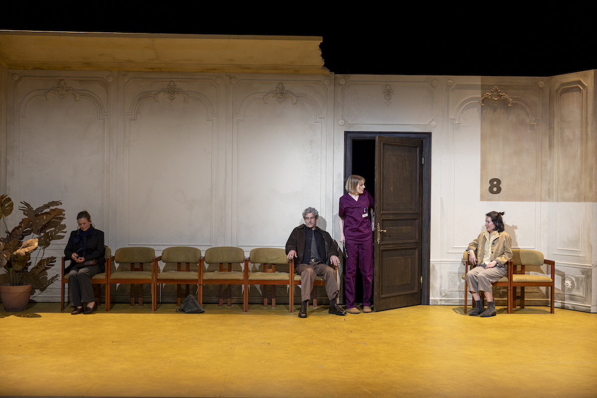 29. März 2025. Von Publikumsseite kommen die Schauspieler_innen einzeln herunter, streichen am Vorhang entlang, verschwinden dahinter. Die letzte zerrt ihn auf, gibt den Blick frei auf eine Wartezimmerkulissenwand mit beige-deprimierend gepolsterten Stühlen. Sie hetzt im Altenheimbesucherlook, in den vier der fünf Spielenden gekleidet sein werden, auf die inzwischen auf einem der Stühle platzierte Ekaterina zu, deren Mutter gerade gestorben ist.