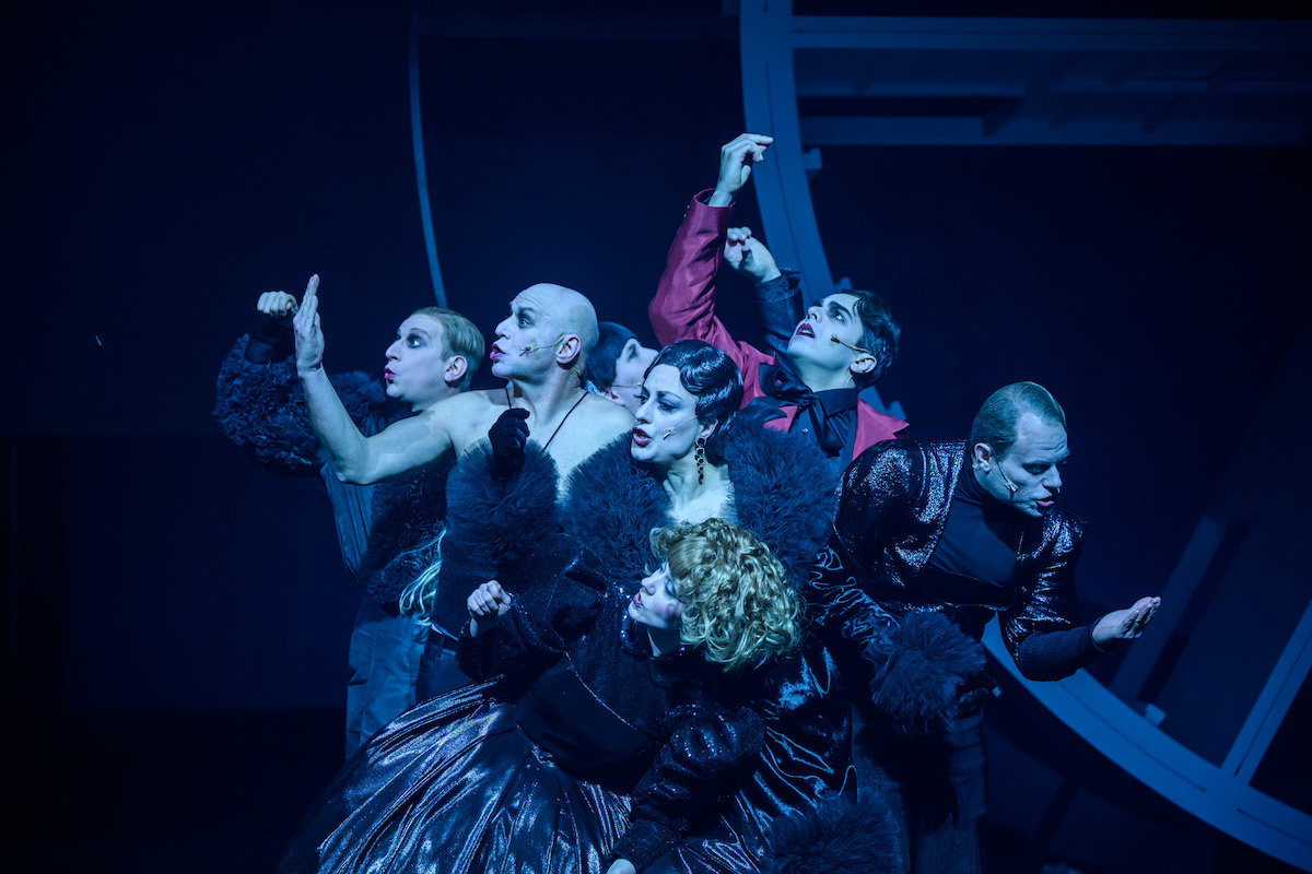 Spaß wollen sie haben, die Getriebenen. Eine hitzig aufgeladene und nervöse Zeit ist das. Derweil drohen die Marschierenden. Die Kostüme von Cornelia Kraske, mal schwarz-weiß, mal bunt glitzernd, brechen den Twenties-Look mit Rüschen, Springerstiefeln und pinken Tutus – und auch mit windschiefem Bob oder Herrenwinker an männlicher Schläfe.