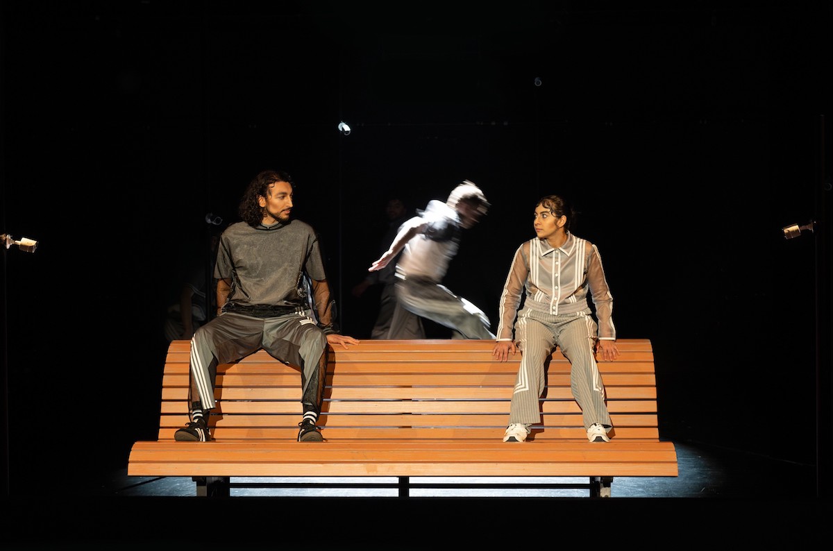 Auf der Parkbank hängen Hassan und seine Freunde ab, es wird vor allem diskutiert, gelegentlich auch mal (dahinter) geturnt. Andere Regieanweisungen werden als Text mitgesprochen, aber nicht gespielt ("Omar greift nach der Sportzigarette"). Manchmal steigt eine:r aus und in den Monolog hinein. Alles schön episch. Die Regisseurin vertraut ganz auf den Text: Rhythmisch, poetisch, klar ist dessen Sprache, sehr dicht, sehr wortreich.
