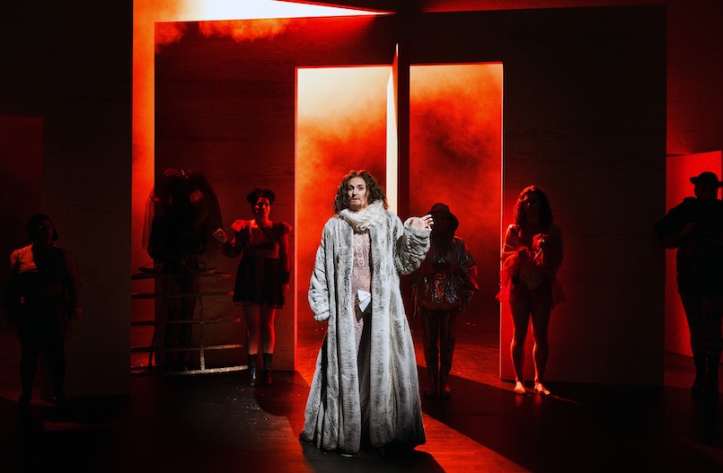 7. Oktober 2023. Eine kahle hölzerne Wand verläuft über die gesamte Bühne. Mehr nicht. Visuellen Prunk erwartet man beim Anblick dieses flächendeckenden Bühnenbilds schon mal nicht. Doch inmitten dieser Wand öffnen und schließen sich plötzlich Drehtüren, durch die allerlei exzentrisch gekleidete Gestalten ein- und ausgehen, umhüllt von orangefarbenem Licht und Nebel. Und die karge hölzerne Kulisse wird kurz darauf zur überdimensionalen Leinwand für szenische Videoprojektionen. Ein wahres Feuerwerk aus pittoresken Landschaftssequenzen, vor denen und auf denen die Schauspielerinnen und Schauspieler lustwandeln und ihre Charaktere verkörpern, sich durch wütende Meeresstürme an Land retten oder durch die zwitschernde Atmosphäre eines Waldstücks flanieren.