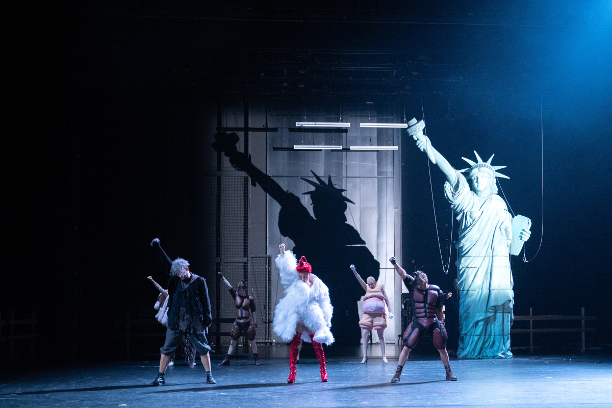 28. April 2024. George Orwell schrieb seinen berühmten Roman 1944 als Warnung vor dem Stalinismus. Heute gibt's längst Analogien und Figuren, die näher liegen. Und sie marschieren in Oliver Frljićs Inszenierung in allegorischer Kostümierung auch auf. Und rösten zum Beispiel Würstchen über der Fackel der Freiheitsstatue. Großer Theaterspaß!
