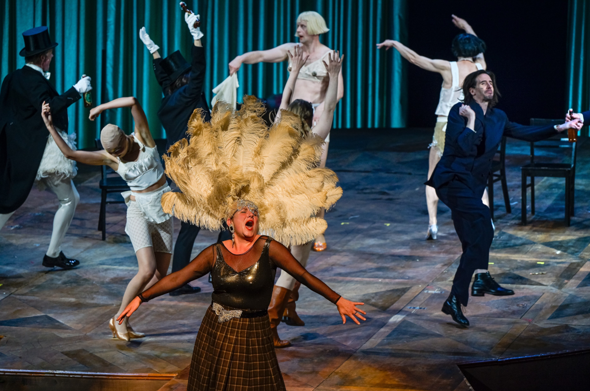 Aber die Regisseurin Corinna von Rad macht einen entscheidenden Fehler. Sie veralbert den Romanstoff. Setzt etwa auf platte Travestie wie im Falle von Gabriel Dans reichen Verwandten: Josephine Köhler als Onkel Phöbus steckt im Fatsuit mit schütterem Haar, stapft breitbeinig, artikuliert sich so laut und schrill, dass Brotbrocken explosiv aus dem Mund knallen. Und der lange Kerl Gábor Biedermann spielt Phöbus' Frau mit Riesenbusen und klischeehaft hochgetunter Stimme. Ständig Knallchargentum, schenkelklopfende Übertreibung: heiseres Lachen, Gebrülle, zappelige Choreos, in Frack samt Tütü herumhüpfende Männer.