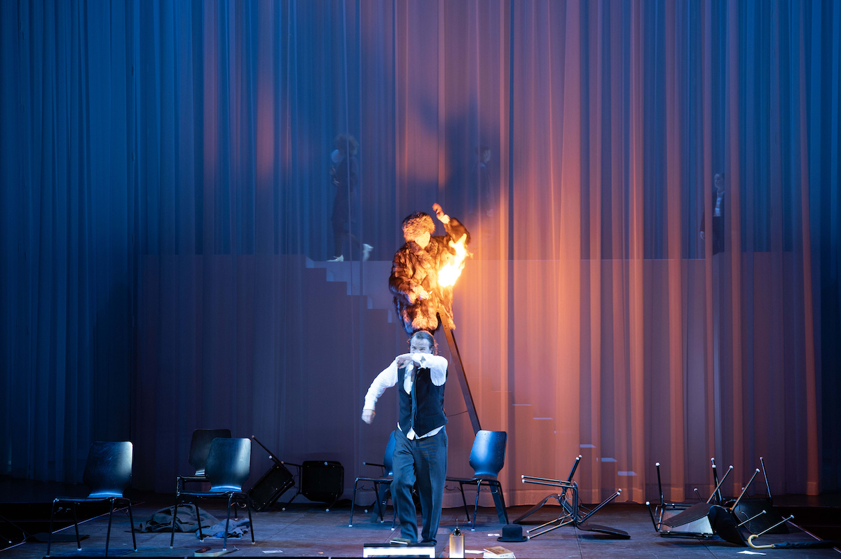 Wenn sie Erzählpassagen übernehmen, tun sie dies meist an einem der beiden Mikrofone links und rechts. Die hängen von der Decke und treiben gern ihr böses Spiel mit den tapferen Erzähler:innen, indem sie nach Belieben hoch und runter fahren und sie in die Knie oder auf die Zehenspitzen zwingen. Das schafft bisweilen theatralische Hektik, obwohl ironischerweise eh alle Sprechenden mit Mikroports ausgestattet sind.