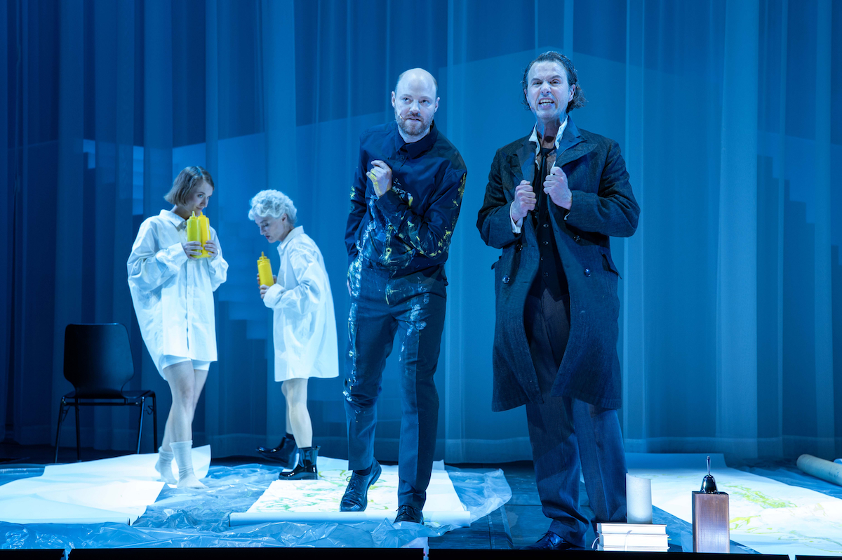 So kann es denn losgehen mit dessen morgendlicher Verhaftung durch zwei Wächter. Auch das kurze Laufband unter Röders Füßen geht nun in Betrieb. Es hält bis kurz vor Schluss nicht an, und er verlässt es nicht, mehr als eineinhalb Stunden lang. Je nach Gefährlichkeit einer Szene wird das Band mal schneller, mal langsamer und bringt den Protagonisten gehörig ins Schwitzen. Die anderen Spieler:innen ziehen ihn an und aus, schütteln ihm die Hand und stecken ihm Dinge in den Mund. Sie schleppen Requisiten herbei und räumen sie wieder weg.