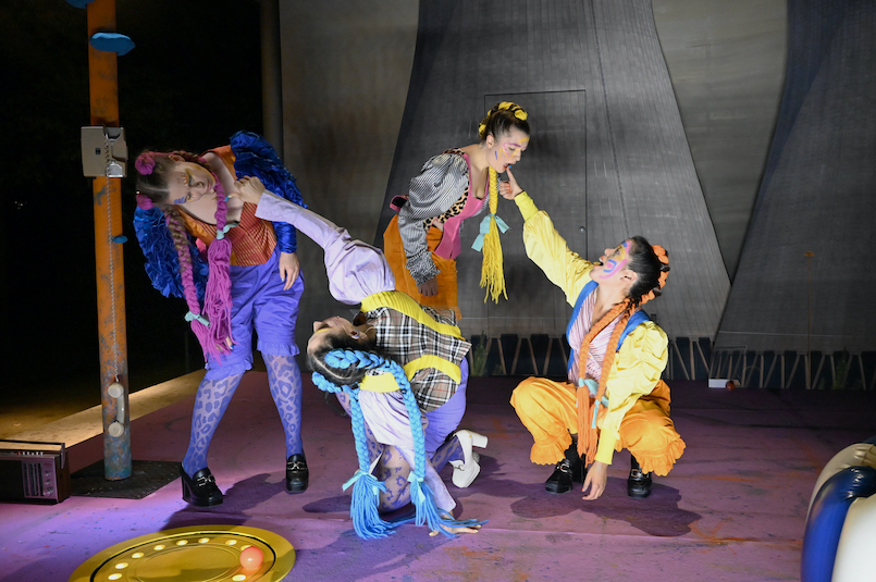 Diese Doppelung ist ein bewusst gesetztes Zeichen dafür, dass sich hier ein Theaterabend in gewollter, gezielter, geplanter Unübersichtlichkeit und Rätselhaftigkeit abspielt. Hänsel und Gretel sind schräge, buntbezopfte Wesen, die vor dem Hungertod ins Wohnwagenland geflüchtet sind hin zur Hexe, die eine schwer zu definierende Rolle spielt. Man sieht sie nicht, man hört sie nur. Hänsel und Gretel haben Hunger, weil ihre Eltern im Zwang der Optimierung des Lebens alles Leben, alle Natur und alles Essbare zerstört haben. Jetzt wollen die Geschwister diese Welt vor dem Hunger retten, da wird die Gretel zwischendurch zur kämpferischen Greta.