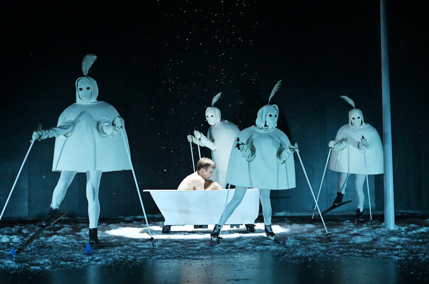 Unheimliche Wesen auf Skiern greifen an: "Brauner Schnee über Franken" am Schauspiel Erlangen mit Kai Götting in der Badewanne © Martin Kaufhold