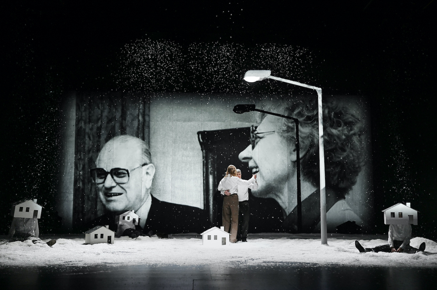 1. März 2026. Auf der Bühne des Markgrafentheaters Erlangen steht nur eine einsame Straßenlaterne, als der eiserne Vorhang hochfährt. Das "Carol of the Bells" erklingt. Es schneit. Durchgängig, von Anfang bis Ende der Vorstellung. Geschneit hat es auch am 19. Dezember 1980, der Tag, an dem der Rabbiner Shlomo Lewin und seine Lebensgefährtin Frida Poeschke in der Ebrardstraße 20 erschossen wurden. Der Schauplatz des Verbrechens liegt vom Schauspiel Erlangen nur etwa eineinhalb Kilometer entfernt.