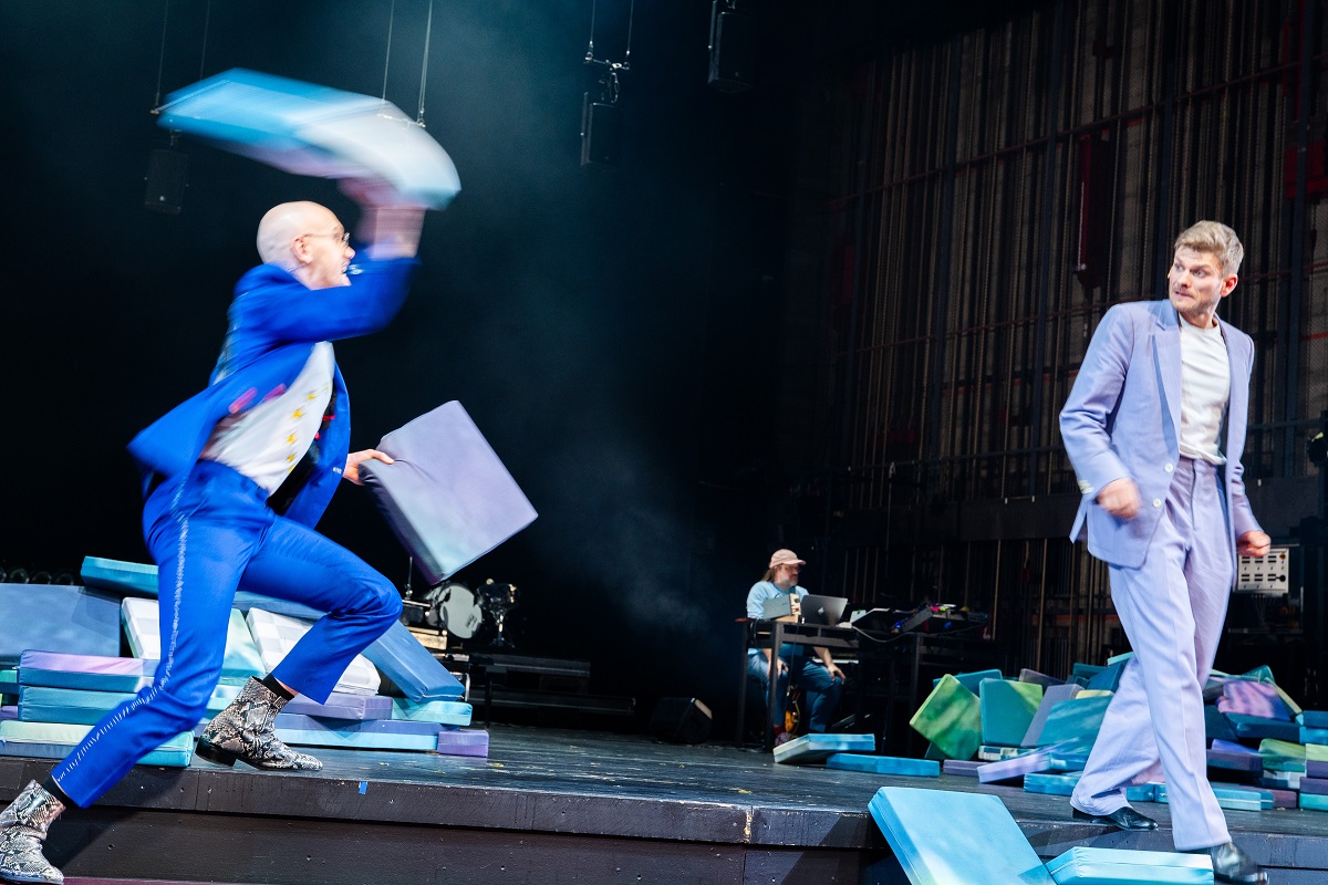 Die zwei Stunden vergehen im Großen Haus wie im Flug. Dicht sind die Bilder, da kommt kaum Distanz auf, zumal die Bühne (von Matthias Nebel) vorhanglos in die Zuschauerränge hinein verlängert wurde: eine Abfolge von Abstufungen mit einer Unzahl von multifunktionalen Kissen, die überall chaotisch verteilt liegen, zu Bergen aufgetürmt oder in kleinen Gruppen.