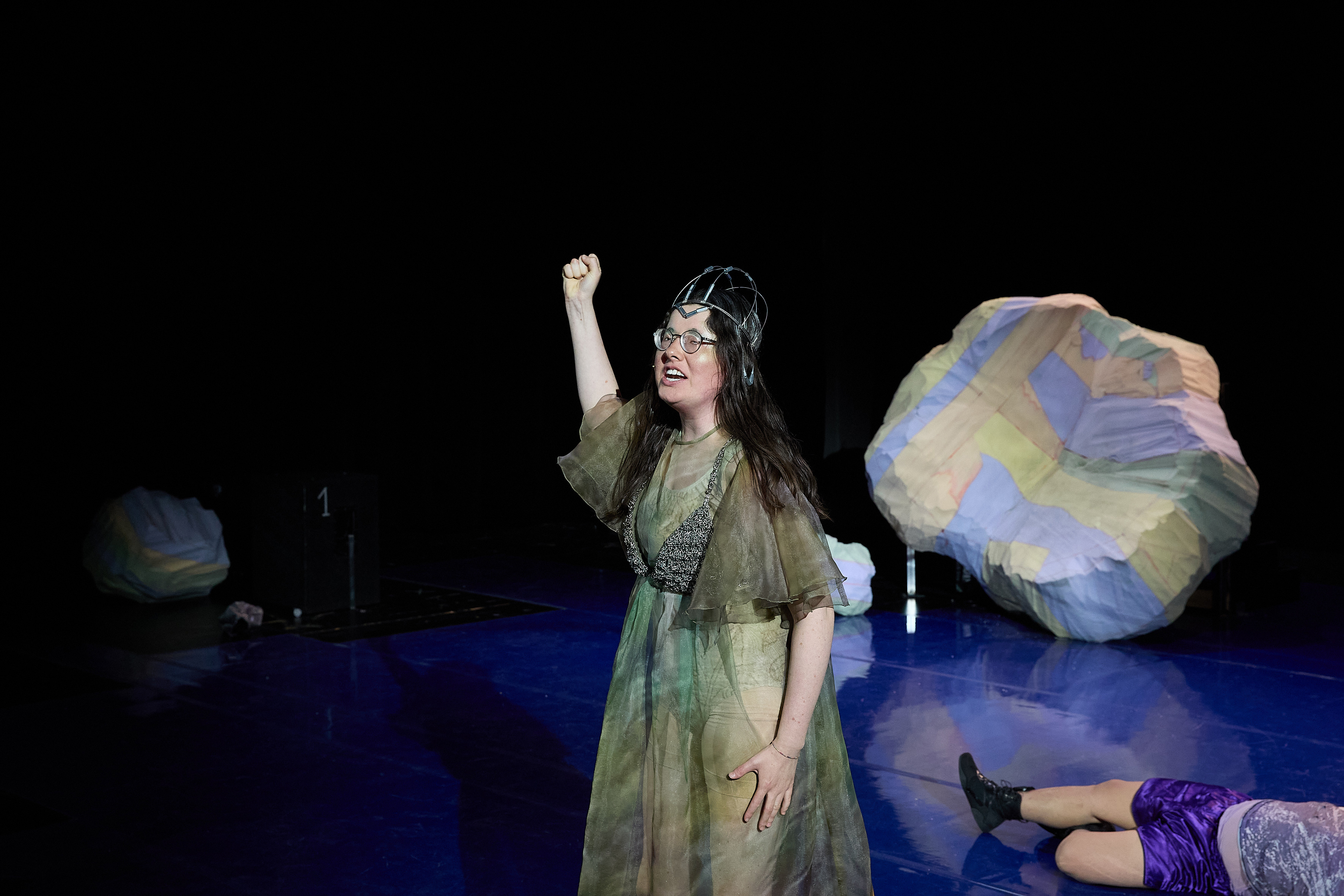 Das Trinken des Liebestranks haben wir irgendwie verpasst, es muss gerade noch etwas anderes auf der Bühne passiert sein. Zum Glück gibt es Maren Solty als Erzählerin beziehungsweise als Brangäne. In der einen Rolle hält sie das Geschehen zusammen und baut Brücken, wenn hier und da mal etwas Text durcheinander gerät. Als Brangäne ist sie Isoldes treue Dienerin, die sich bescheiden zurückhält, aber irgendwie genauso unerlässlich für die Geschichte ist.