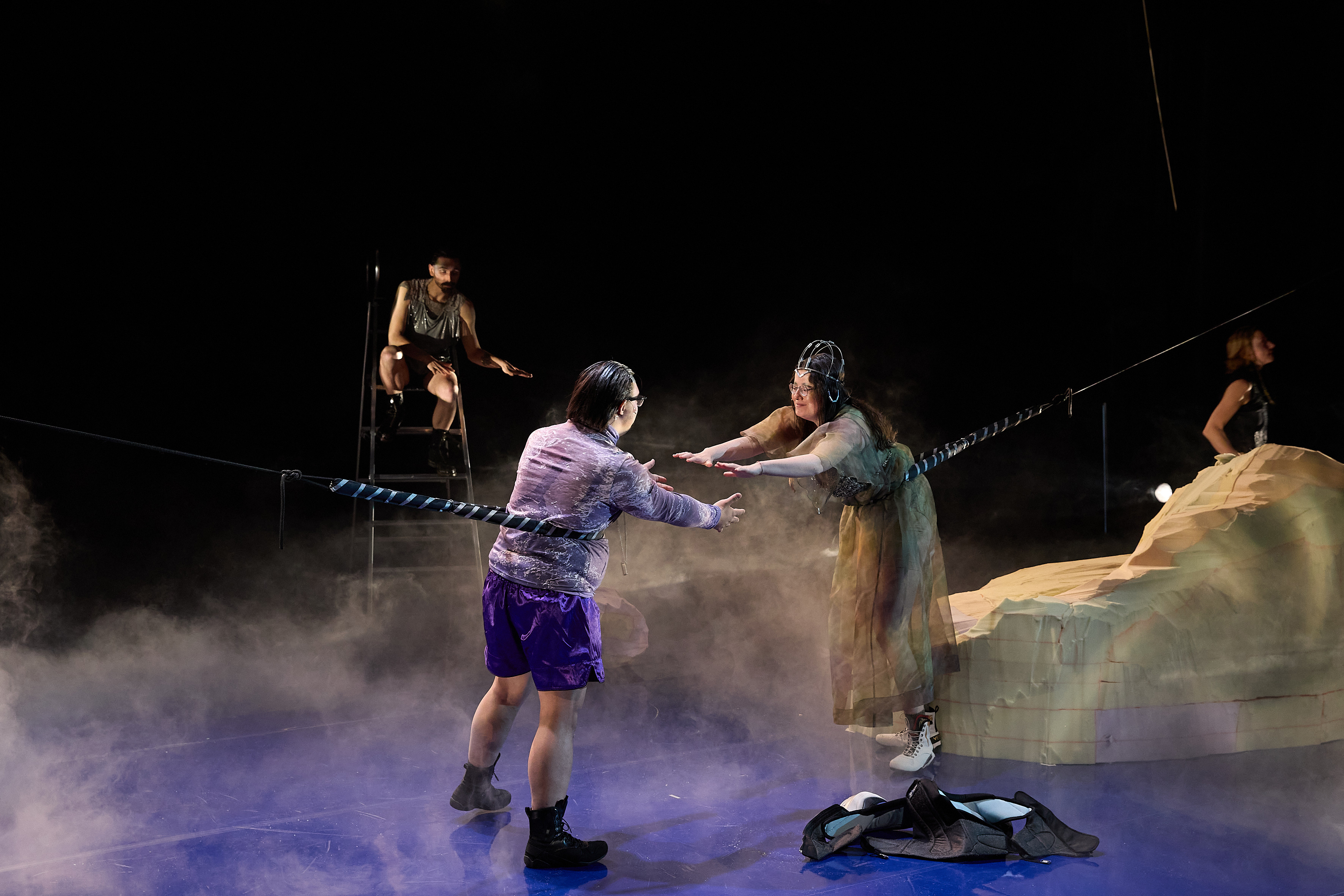 Die Titelfiguren sind leider kaum wirksam als Protagonist*in. Isolde immerhin hat ihre kleinen Intrigen, aber in erster Linie treten Kappauf und Fell-Hernandez auf, um allegorische Bilder zu bevölkern. Als der Liebestrank wirkt, hängen sie an langen Gummibändern wie beim Fußballtraining, die sie gerade so nicht zusammenkommen lassen. Die Idee immerhin ist einfach und gut, wie der Rest der Bühne von Klara Mand und Sabina Winkler. Auf Schaumstofffelsen lassen sich Drachen besiegen und als Markes Thron dient ein Schiedsrichter-Hochsitz vom Tennisplatz. Ein Ruder-Fitnessgerät steht für den Schiffs-Pendelverkehr zwischen Cornwall und Irland. Am vielseitigsten ist ein Kettenvorhang, der wahlweise für ein Versteck steht, als Leinwand für Projektionen dient oder sich in der Hochzeitsnacht in ein Zelt-Gemach verwandelt.