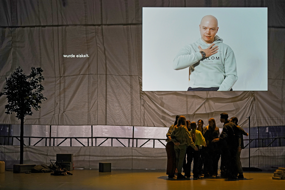 Leider ist diese Inszenierung nicht vollständig gelungen. Die Dokumentarebene, die "talking heads" erreichen mich schon, sind aber letztlich Fernsehen und auch überpräsent. Die SpielerInnen dagegen, die sicherlich jede/r für sich etwas riskieren, stehen irgendwie als Statisten ihrer selbst auf der Bühne. Einiges mag darin begründet sein, dass hier doch das Trennende zu groß war, das künstlerische Team das "was ist" am Ende akzeptieren musste. Und so wird das Trennende natürlich thematisiert und inszeniert. In der Tat muss man dann doch schlucken, wenn auf einmal die UkrainerInnen abtreten und "Teil 2" auf die Bühne projiziert wird.