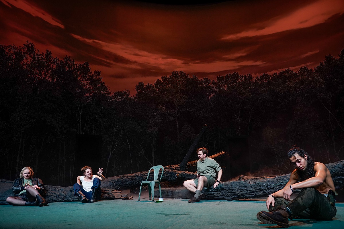 Da lässt sie Stückl auch buchstäblich. Das Messi-Farmhaus in Arkansas, zu dessen Versteigerung die Lafayettes eigentlich zusammenkommen, hat Bühnenbildner Stefan Hageneier durch einen mit Bäumen bemalten Rundhorizont-Prospekt ersetzt. Davor liegen verkohlte Stämme auf der Bühne und qualmen noch. Es riecht nach Rauch. Unsichtbar hinter dem schwarzen Holz platschen die Schauspieler*innen bei ihren Auf- und Abgängen lautstark durch eine große Pfütze, deren bewegte Oberfläche wellige Schatten auf den Hintergrund wirft. Wenn ein Familienmitglied das Fotoalbum aufschlägt, überlagern Videos das Waldbild.