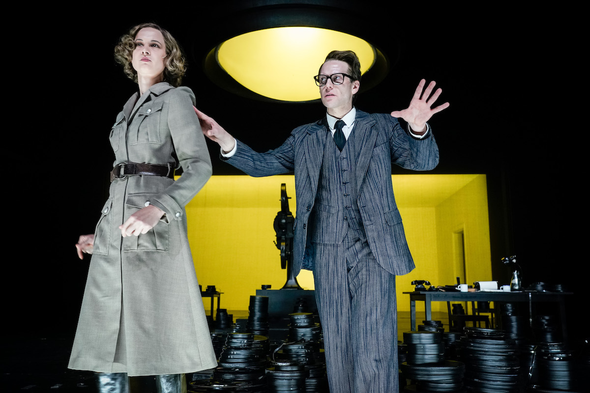 Das hat mehrere negative Konsequenzen: die Theaterzuschauer, die den Roman nicht kennen, werden an der Hand genommen und durch den dreistündigen Abend geführt, aber die Figuren werden eindimensionaler. Das gilt nicht nur für G.W. Pabst, sondern auch für seine real existierende Frau Gertrude und seinen fiktiven Sohn Jakob. Während im Hintergrund Archivmaterial von marschierenden Nazis über die Leinwand flimmert, verstrickt sich an der Rampe inmitten großer Stapel Filmrollen die Hauptfigur Pabst ohne größere Gewissensbisse immer tiefer in die Kollaboration mit den Nazis. Ein weiteres Manko dieser Erzähltechnik: Szene an Szene wird wie an einer Perlenkette aufgereiht. Linear wird der Weg der Hauptfigur ins Verderben nachgezeichnet. Der Grundton bleibt immer derselbe: düster und anklagend. Der satirische Witz, den einige Buchkapitel bieten, z.B. der glänzend beschriebene Lesezirkel, in den Pabsts Gattin gegen ihren Willen hineingerät, oder die Revierkämpfe zwischen Riefenstahl und Pabst bei den „Tiefland“-Dreharbeiten, blieb an diesem Theaterabend leider auf der Strecke.