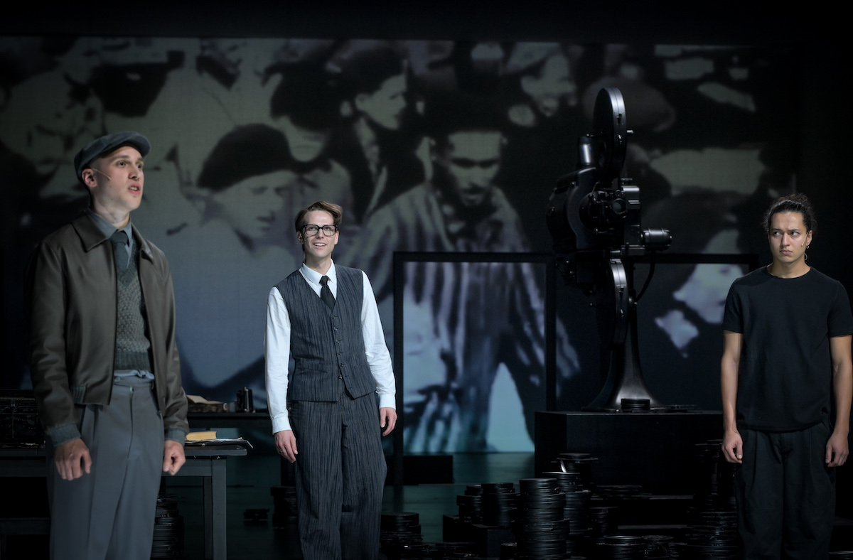 So flimmern zu Beginn Collagen aus Archivaufnahmen über die Bühnenrückwand. Am Ende der Sequenz: eine Tonaufnahme von Hitler. Bühne und Kostüme sind schwarz-weiß, wie die Filme im Hintergrund, alte Filmrollendosen türmen sich zwischen papierbehäuften Arbeitstischen. Die Historie im Hintergrund. Davor die Fiktion auf der Bühne.