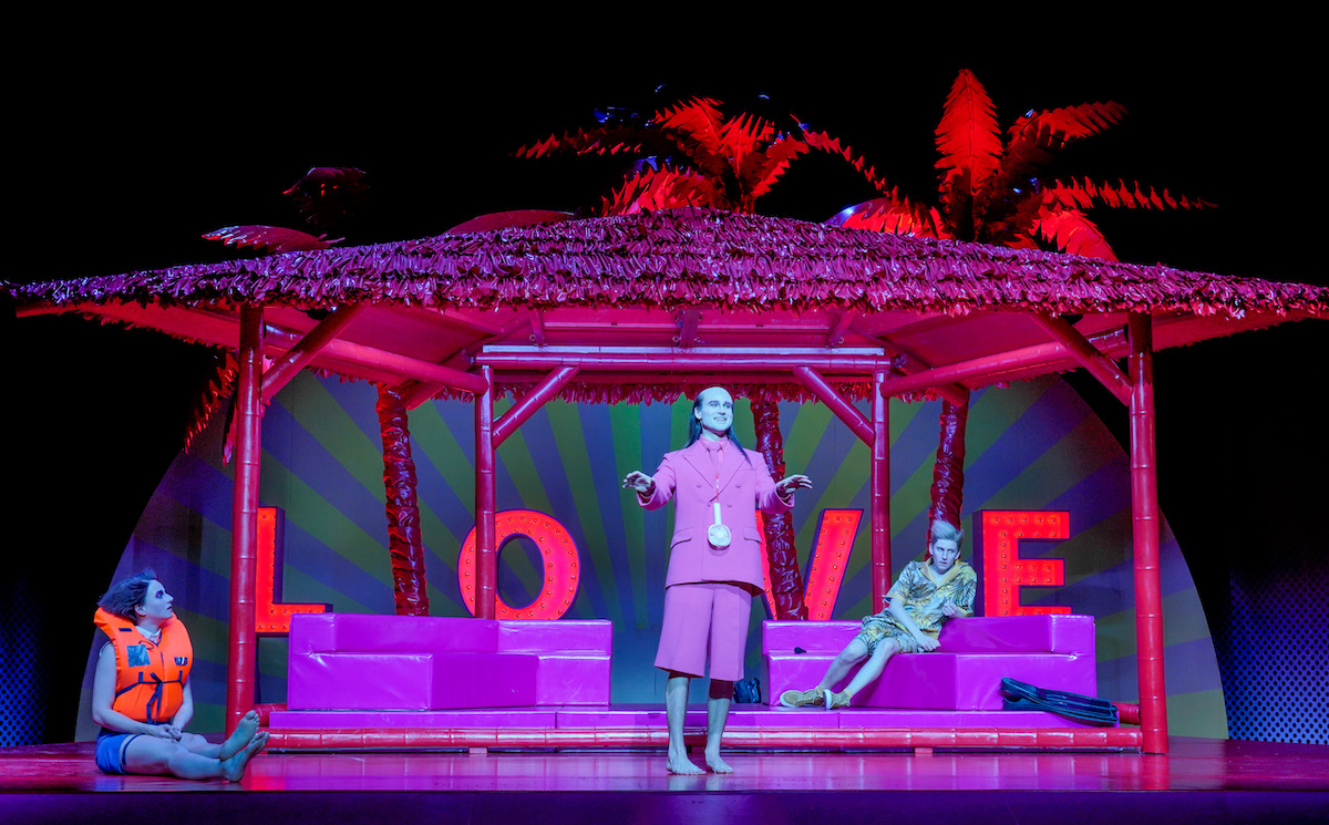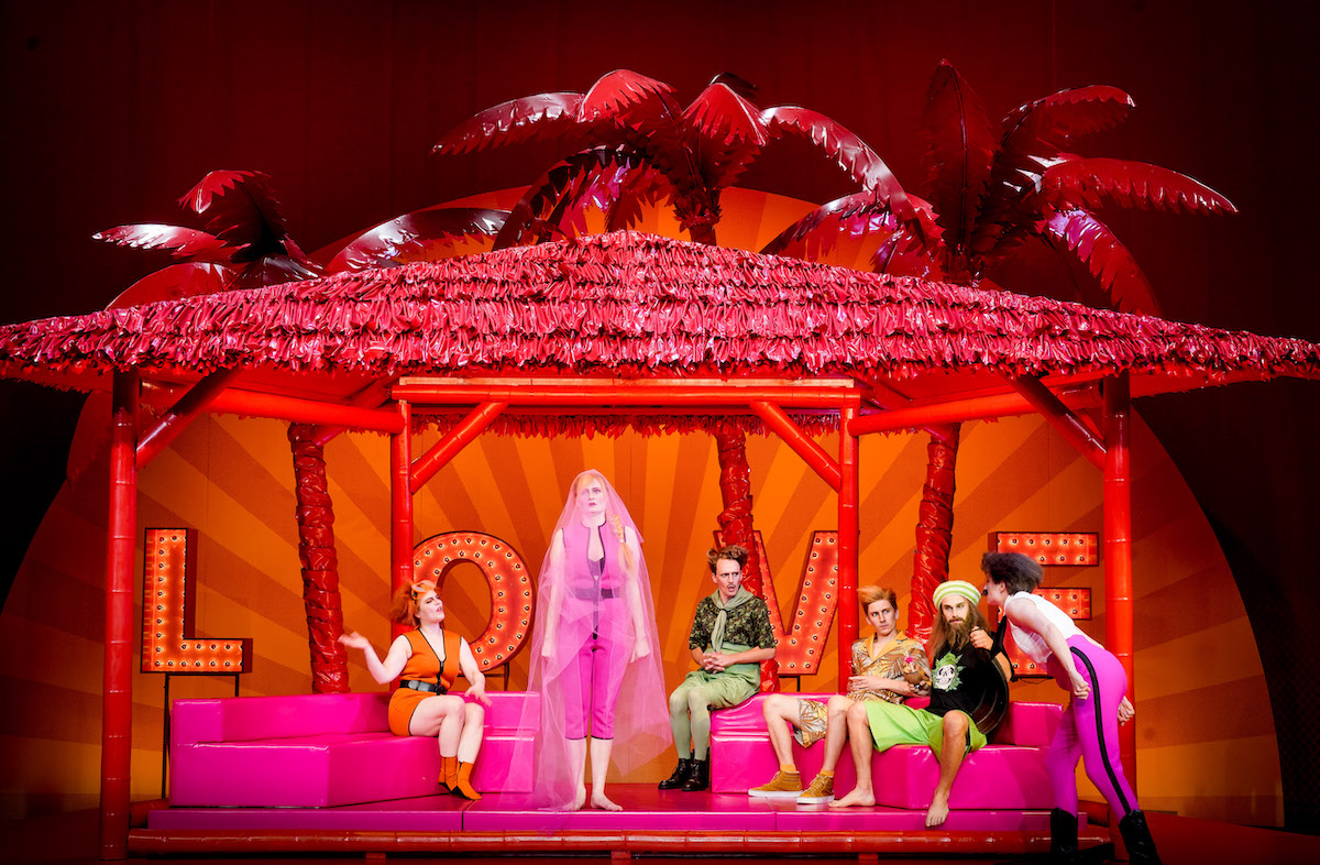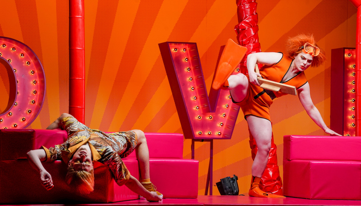 Stefan Hageneier hatte damals schon viel Rot ins Bühnenbild gemischt. Das Rot für Illyrien aber ist kein politischer, sondern ein Künstlichkeits-Marker: Eine Art japanisches Teehaus mit rot lackiertem Reetdach ist von blutroten Palmen überschattet. Sattpink die Plastikcouch im Inneren, pink schreien anfangs auch die mit Lämpchen besetzten Lettern "L O V E". Sie hängen vor einer Scheibe, die wie die obere Hälfte eines Glücksrads aussieht und die Tiefe der Bühne begrenzt.