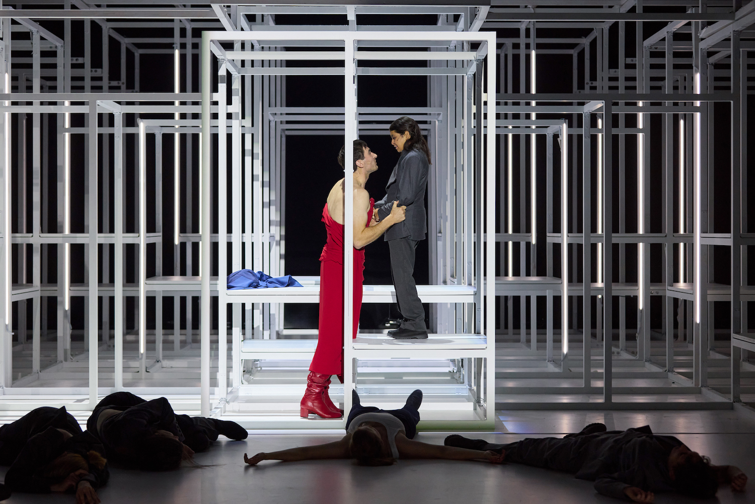 Wenn also die Besetzungs-Strategie ziemlich daneben gegangen ist – alle weiblichen Darstellerinnen sind übrigens in blaue und graue Unisex-Anzüge gesteckt worden, bei denen das Sakko wie eine Mischung aus Designer-Look-Zwirn und Zwangsjacke aussieht –, so bereitet der Theaterabend doch auch einige beeindruckende und fesselnde Momente. Als Spielfläche kommt eine Metallkonstruktion mit Neonröhren zum Einsatz, die als Mischung aus Gitterkabinett, Irrgarten, Ninja-Warrior-Trainingsgerät und Pole-Dancing-Käfig höchst symbolische Assoziation hervorruft (Bühne: Sam Beklik). Atmosphärisch stimmig auch die bedrohlich nuancierte Musik von Dani Catalán.