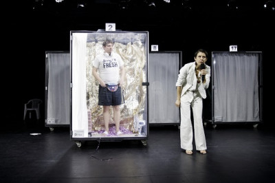 Nürnberg, 31. Januar 2020. "Germany. Why not!" steht auf dem Plakat mit dem staatstragenden Bundesadler – und es dauert nicht lange, bis das als blanker Hohn mit Behörden-Siegel erkennbar wird. Wir Teilhabende, oben die Performer und unten das Publikum, sind womöglich in einer zu engen Lücke zwischen den TV-Formaten Dschungelcamp und Big Brother eingeklemmt, aber die schnatternde Moderatorin des schwarzrotgoldbunten Abends, die uns gleich beim ersten Auftritt im Namen der Bundesrepublik ein kumpelhaftes "Heike" anbietet ("Ich habe früher sehr viel mit Kindern gearbeitet"), kennt sich aus mit Gewissens-Druckstellen und der befreienden Wirkung diverser Wahlkampf- oder Spielshow-Erregungen. "Wer bis zum Schluss bleibt, kriegt einen Kugelschreiber!, verspricht sie dem "Saal voller einheimischer Zuschauer", den der Autor Philipp Löhle in seinem neuen Stück "Andi Europäer" neben fünf Prototypen aus deutschen Landen auf der Besetzungsliste wünscht.