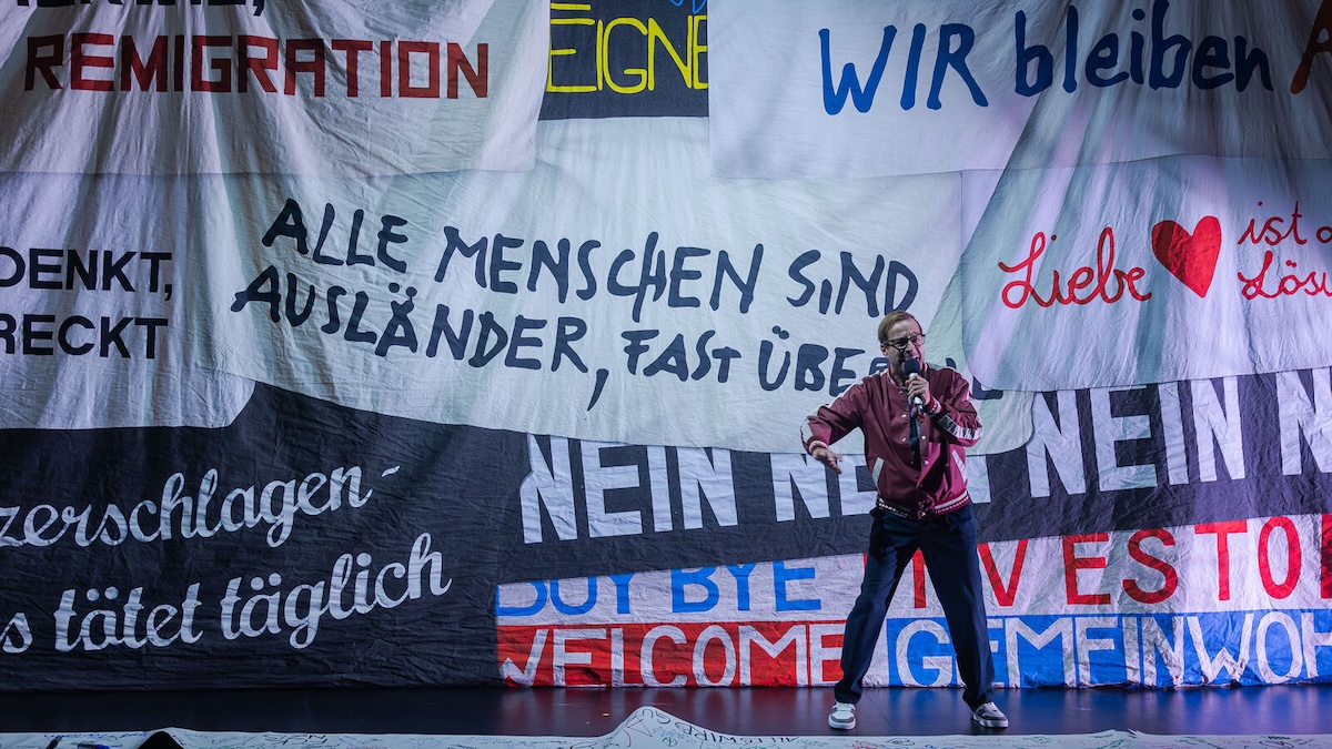 Der Fünfakter sucht seine komödiantische Fassade um jeden Preis aufrechtzuerhalten. Wie soll man die Verzweiflung ob der verzwickten Lage, in der sich unsere Demokratie befindet, auch sonst aushalten? Aber die Tragik bahnt sich doch mehrfach ihren Weg, etwa wenn aus der Hauptorganisatorin des Festes, verkörpert von Natascha Weigang, am Bühnenrand ein verzweifelter Monolog über das globale Erstarken von Autokraten und Faschisten herausbricht. Solche Momente, in denen Sätze zu Ende geführt werden und drängende Gedanken in voller Länge herausplatzen, weil es zu schmerzhaft wäre, sie weiter nur im Kopf herumzuwälzen, hallen lange nach.