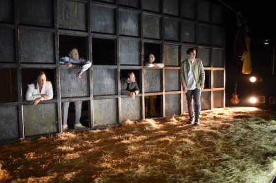 Regensburg, 13. April 2019. Das Bild ist bekannt von deutschen Autobahnen: die Tiertransporter, in denen jedes Lebewesen nur ein kleines Kästchen Raum hat. Darin sitzen Kreaturen, die zum ersten und einzigen Mal in ihrem Dasein die Sensation der Frischluft erleben, bevor's ins Schlachthaus geht. Diese Kästchen prägen neben einer Ladung Stroh auch das Bühnenbild (von Valentin Baumeister) in dem Theaterstück "Die letzte Sau", das Regisseurin Julia Prechsl für das Theater Regensburg aus dem Drehbuch des gleichnamigen Films entwickelt hat.