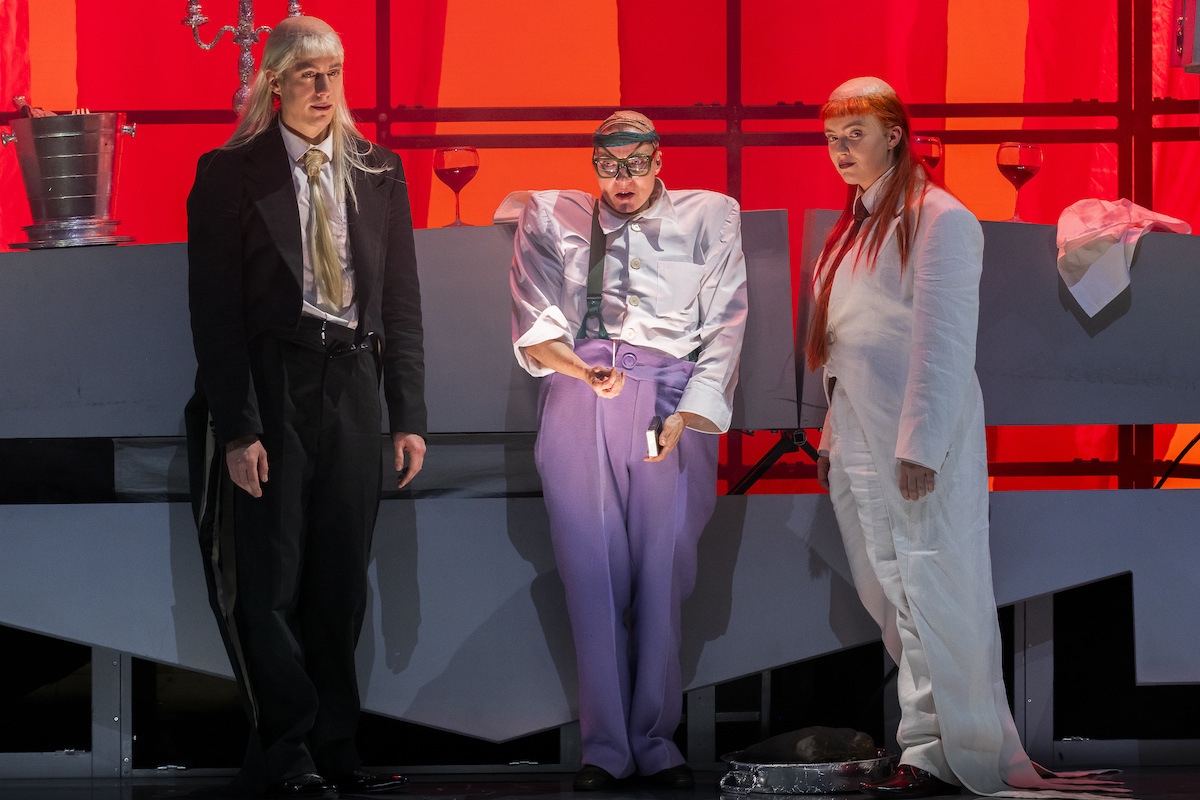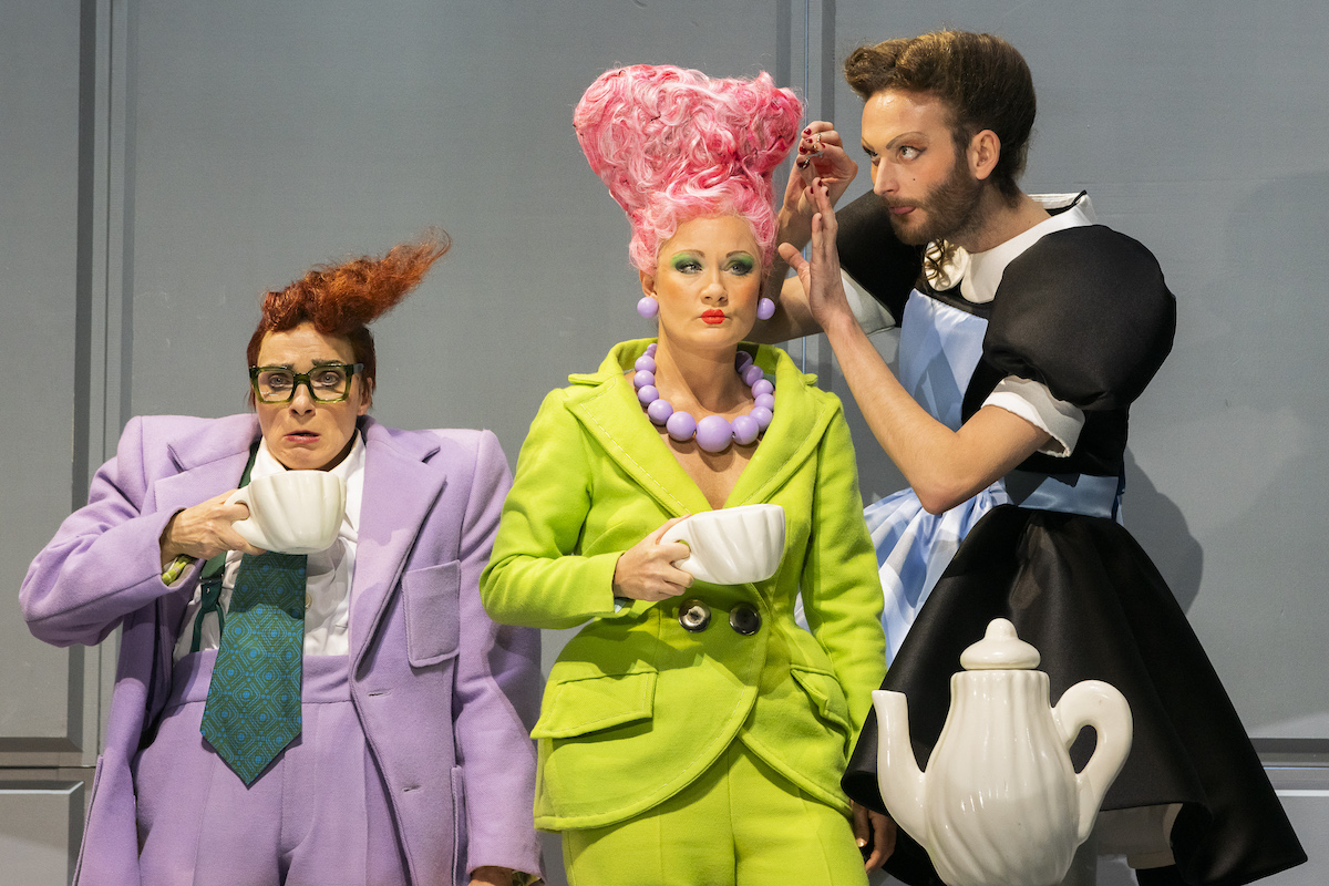 Die Komödie schnurrt in Kostümen von Esther von der Decken: Max Gindorff, Kathrin Wehlisch, Maeve Metelka © Jörg Brüggemann
