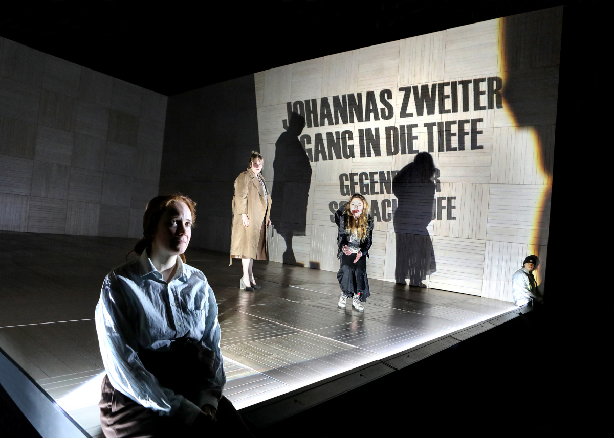 Um in Johannas Abgrund anzukommen, benötigt die Inszenierung knapp über zwei Stunden. Massive Textberge türmen sich, trotz Kürzungen, und das (welt)politische Anliegen geht in Aufmerksamkeitssenken verschütt – alles wird gesagt, das wenigste ausagiert. Beständig deklamiert das Ensemble frontal ins Publikum, mit nur wenig Stellungsspiel auf der von Pařízek entworfenen, schrägen Holzkistenbühne. Gegen die Ermüdung helfen auch anfängliche Publikumsbespaßungen von Kathleen Morgeneyer und suggestive Schattenspiele mit Overhead-Projektor nicht, genauso wenig Amelie Willbergs rotzig-schlaue Schlagfertigkeit oder Einfälle wie ein Tauziehen zwischen Cridle und Mauler um Reinspergers opulente rote Schleppe.