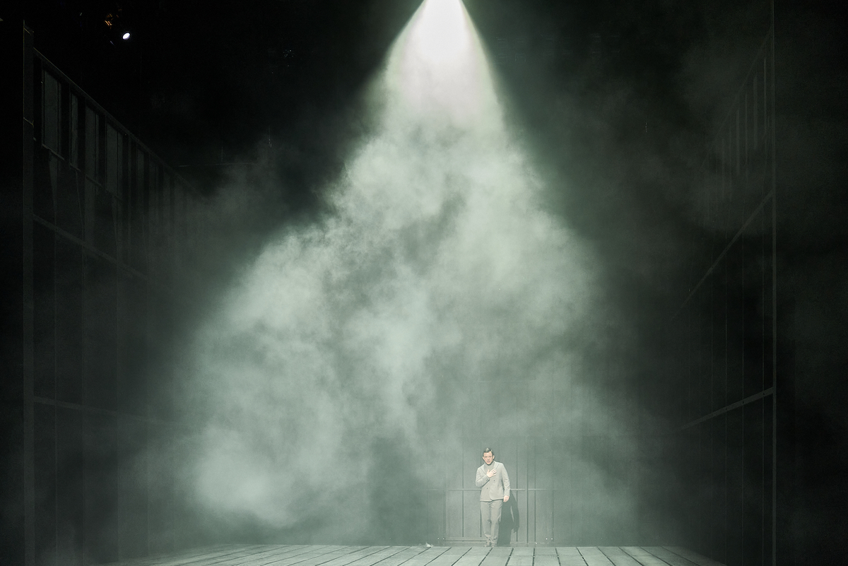 27. Januar 2024. Tausend Töne Grau. Kommunismus war schon mal bunter. Für Mateja Koležniks Inszenierung von Jean-Paul Sartres Politmord-Drama "Die schmutzigen Hände" hat Olaf Altmann einen Bretterkasten auf die Bühne des Berliner Ensembles gestellt. Portalhoch, mit Spalten, durch die helles Licht dringt wie zerscheibt. Nebel wallt. Schreie, eine Frauenstimme. "Nicht schießen!" Und dann stürzt mit großem Krach die vordere Wand nach hinten zu Boden. Zum Vorschein kommt: ein Mensch. Und um ihn: Leere.
