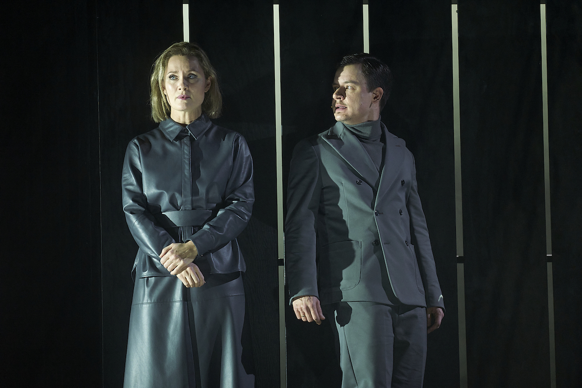 Das Dialog-Duell der beiden Ungleichen ist über weite Strecken dick mit den Sounds von Bert Wrede unterkleistert. In dieser von Mateja Koležnik psychologisch-realistisch angelegten Männerwelt kommen auch die Frauenfiguren nicht übers Klischee hinaus. Pauline Knofs Olga, mit der Hugo anbandelt, ist zackig in Parteidiensten unterwegs, dem Geliebten gegenüber dienstbar. Seine Ehefrau Jessica ist bei Lily Epple eine hinter dem Vorwand weiblichen Nichtwissens taktisch klug handelnde Verbündete. Als blond gleißende Femme fatale entsteigt sie anfangs oben ohne einer Truhe (die Stripperin als Assistentin des Magiers – ist das die Vorstellung einer weiblichen Regisseurin von einem Männertraum?). Was sie an dem blassen Jüngling findet, weiß sie irgendwann selbst nicht mehr und wendet sich Schulzes etwas weniger blassem Hoederer zu, der ihr, wider besseres Wissen, zitternd und schwitzend verfällt.
