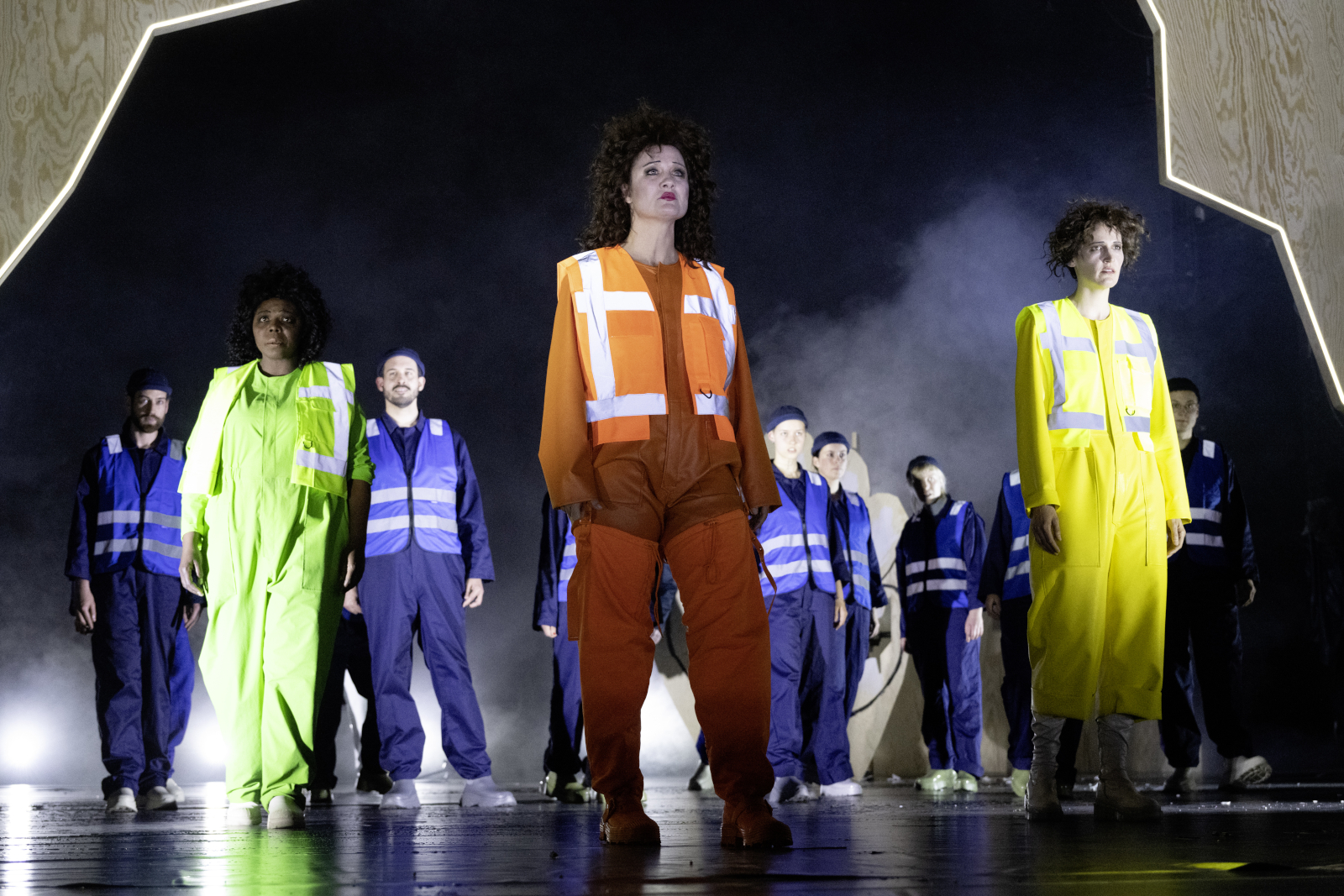 Und die Parabel? Nun ja. Es gibt noch einen Chor, den Regie und Kostümbild (Jelena Miletić) zweckmäßig in verschiedenfarbige Warnwesten gesteckt haben, damit man auch sicher weiß, mit wem man's zu tun hat: Auftritt der Ausgebeuteten, die der Willkür Puntilas schutzlos ausgeliefert sind. Sie rotten sich dann und wann zusammen, um Paul Dessau oder Billie Eilish zu singen, elegant arrangiert von Johannes David Wolff. Wir im Publikum gehören auch dazu, sobald Puntila und Matti während der Gesindemarkt-Szene von der Bühne steigen und im Saal nach geeigneten Arbeitssklaven Ausschau halten. Blöd nur, dass alle passive Staffage bleiben, wir hier unten genauso wie die oben im Chor. Allesamt Begleitpersonal für den großen Untergeher im Zentrum.