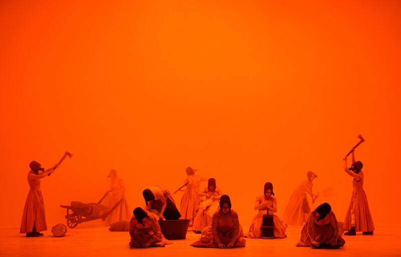 Jette Steckel und ihr Team setzen Kirkwoods Epochenwandel-Drama ebenso hybrid in Szene wie der Text angelegt ist. Neben realistisch psychologischem Spiel gibt es chorische Formationen, die Loyalitäten oder auch Abstimmungsverhältnisse sichtbar machen. Alle Frauen tragen zudem die gleichen orangfarbenen Outfits, mit Bluse, Mieder und Rock, dazu schwarze Stiefel und schwarze Hauben, welche die Kostümbildnerin Andrea Schraad mit einer Art Scheuklappen versehen hat. Und dann gibt es abstrahierende Momente. Eindrücklich ist die Choreographie der Alltagsarbeiten zu Beginn. Kraftvoll dreschen, hacken, stampfen und schrubben die elf Frauen, verrichten ihre Tätigkeiten rhythmisiert im Techno-Takt. Ihre Flegel, Äxte, Butterfässer und Bürsten schwingen sie dabei wie Waffen – eine physische Kraft, die in Spannung zur gesellschaftlichen Ohnmacht steht.
