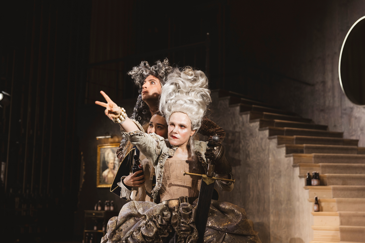 Vulesica inszeniert den Text grell und überzeichnet und in irrwitzigem Tempo. Mit absurden Tanzeinlagen, offenen Schnittwunden und Blutfontänen (Video: Philip Hohenwarter). Überdreht rauschen die Spieler*innen durch ein angeknabbertes Edel-Entrée mit Chaiselongue und geschwungener Treppe (Bühne: Henrike Engels), bekriegen sich in den grandiosen Kostümen von Janina Brinkmann, die voller Anspielungen sind auf Sonnenkönige und solche, die es werden wollen. Geschickt charakterisiert Brinkmann die Figuren je nach Generation mit Rüstungselementen, ausladenden Kleidern und Barockfrisuren, positioniert sie im Trash-, Splatter- oder Historienfilm, zwischen Pop, Allonge-Perücken und "Der Teufel trägt Prada".
