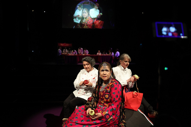 Gob Squad selbst halten sich zurück und performen als Moderator:innen und Übersetzer:innen mit einem Hang zur gepflegten Selbstironie. Als Regisseur:innen überhöhen sie das Geschehen diskret künstlerisch, indem die Schnippel- und Kochgeräusche in raffiniertem Sounddesign mit der Musik gemischt werden. Die Bühne mit der Festtafel ist durch einen Gazevorhang abgetrennt, hinter dem sich die Eigendynamik der Kiezinitiativen quasi ungestört entfalten kann. Wir schauen ihnen also bei der alltäglichen Care-Arbeit des Kochens zu, und dass eines der Merkmale der Care-Arbeit die endlose Wiederholung ist, wird dadurch unterstrichen, dass sich auch einige der Szenen vor dem Vorhang in ihrer Form wiederholen.