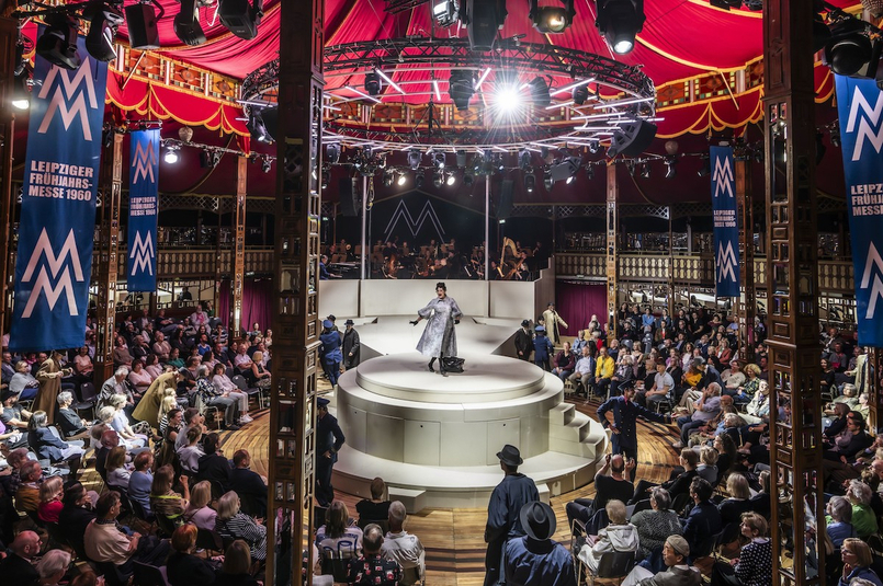 Wie erzählt man das heute? Nahezu so, wie's geschrieben ist. Gut, Alfred Mayerhofers Petticoats und Anzüge wirken viel frischer, als die DDR-Kombinatsware je ausgesehen hat. Und in einigen Modeentwürfen darf man noch mal kurz 60er-futuristisch träumen. Viel Platz haben Axel Ranisch und sein Choreograf und Co-Regisseur Christopher Tölle ohnehin nicht: Die Komische Oper spielt in einem historischen Spiegelzelt vorm Roten Rathaus. In dessen Mitte hat Saskia Wunsch eine kreisrunde Drehbühne gebaut, unter der sich Schubladen zu Arbeitsplätzen ausziehen lassen und in deren Innerem noch eine Art Küche verborgen ist. Dahinter gibt’s eine trapezförmige Spielfläche, die ans Orchester grenzt. Knapp ist der Platz, wirkungsvoll die Arrangements, wenn Chor und Tanzensemble singend durch die Gänge wirbeln.