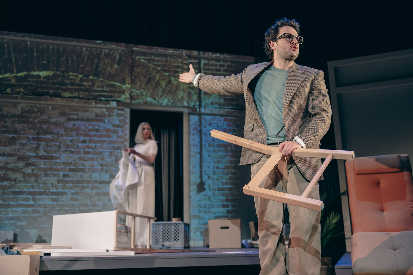 Ronens neuestes Stück legt nun los, als platze der Autorin geradezu das Gegenteil vom Gegenteil heraus. Kaum fünf Minuten steht Dimitrij Schaad da in einem eröffnenden Monolog auf der Bühne, schon ist von Genozid und Gaza, von Holocaust und Auschwitz die Rede. Erstes Seufzen im Publikum. Dabei ging das doch alles gemütlich los. Lange nämlich und unterlegt von smoothem Jazz hatte das Ensemble beim Einlass am Bühnenbild von Magda Willi herumgewerkelt, hier einen Ikea-Stuhl eher dekonstruiert als montiert, dort eine Blumenvase gekittet. Die Metapher zieht sich durch: Es ist ein fragiles, ja reparaturbedürftiges Konstrukt, mit dem wir es zu tun haben. Menschlich, politisch und, wie sich bald zeigen wird, auch theatral.