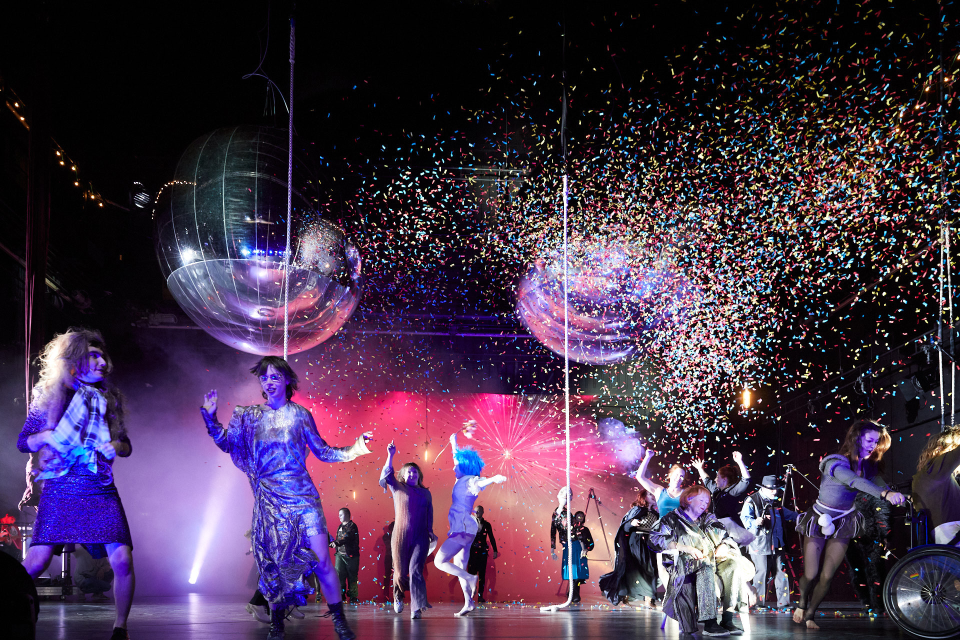 Dann geht es aber auch gleich schon weiter: Regisseur Jacob Höhne und sein Team genießen es in vollen Zügen, den großen Saal der Festspiele zu bespielen, der sonst den prestigeträchtigen Theatertreffen-Einladungen oder den raren Gastspielen aus der internationalen Choreographie-Star-Regie vorbehalten ist. Dramaturgisch ist diese Zirkus-Revue zur Klimakrise nur lose verbunden. Die Assoziationsketten der Texte sind schon beim bloßen Hören herausfordernd. Kein Wunder, dass die RambaZamba-Spieler*innen während der Premiere, wie in einigen Verrissen zu lesen war, mehrfach stockten und quälende Pausen eintraten. Die Selbst-Überforderung ist bei Produktionen dieser inklusiven Bühne leider immer wieder zu erleben und schmälerte auch schon den Spaß an Leander Haußmanns „Einer flog über das Kuckucksnest“. Glücklicherweise hat sich das Ensemble bei der vierten und bereits letzten Aufführung dieser „Performing Arts Season“-Produktion so weit eingespielt, dass es zu keinen längeren Aussetzern kam. Wie von einigen Volksbühnen-Inszenierungen von René Pollesch gewohnt, folgte auch hier die Souffleuse den Spieler*innen auf Schritt und Tritt mit dem Textbuch.