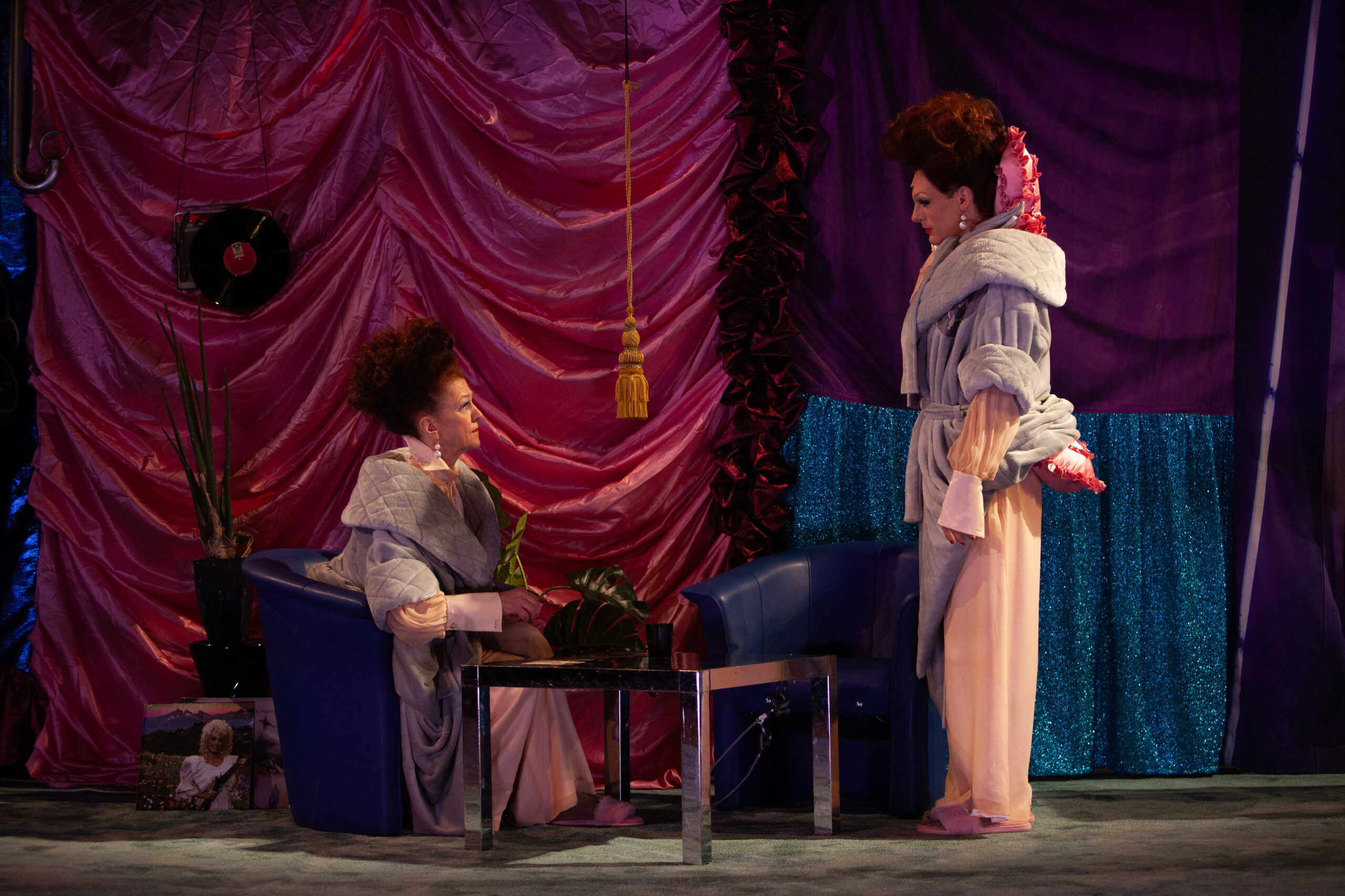 Im ersten leben Conni (Meo Wulf) und Clyde (Christine Groß) als zwillingsgleiche, rokokohaft-spießige Figuren in ihrem pinken Plüschparadies und könnten für immer selig sein, würde sich nicht hin und wieder – wie der leibhaftig im Balkonkasten auftauchende Maulwurf – die Außenwelt mit ihren Kriegen, Katastrophen und Bundestagswahlen in die abgeschottete Zweisamkeit bohren.