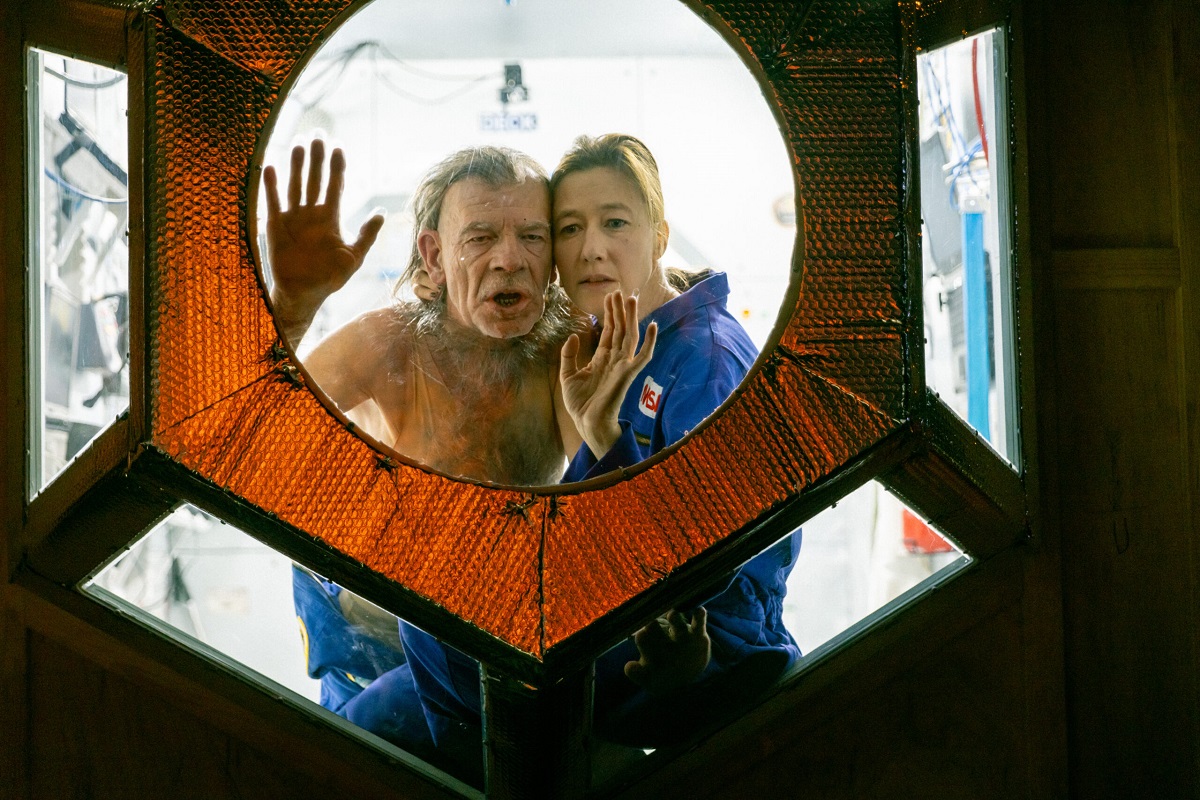 In der Anfangsszene sieht man Martin Wuttke und Zarah Kofler im Cockpit einer angeblichen Soyuz-Rakete sitzen, Kamera nah dran, über ihnen blinkt bunt ein Mischpult, Wuttke drückt imaginäre Knöpfe und Schalter. Von außen sehen wir vorerst nur Sperrholzwände, mit einer in Alu gehüllten Öffnung. Sobald sich die Drehbühne in Bewegung setzt, fällt der Groschen: Wir blicken in einen Nachbau der ISS-Raumstation, inklusive Modulen, vergurteten Lasten und Kabeln sowie dem berühmten Panoramafenster mit Blick auf die Erde (Bühne: Monika Pormale). Hochkonzentriert soll Wuttke angeblich manuell an der ISS andocken – aber weil seine Schauspielkollegin Parfüm trägt, fällt er aus der Rolle. Parfüm, in einer Raumkapsel, "geht's noch?". Cut, der Altstar braucht eine Pause, um seinen kapitalen Wutanfall herunterzukochen.