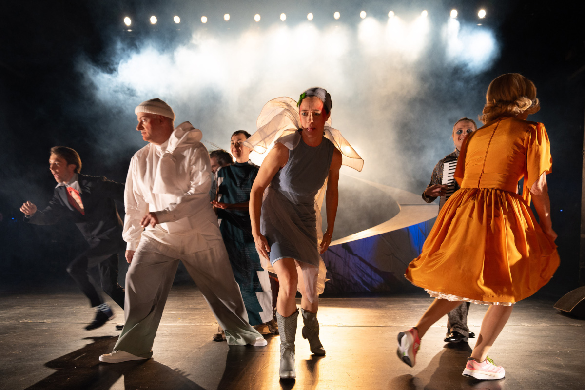 "Das Leben ist gut – dazu gehört Übermut": das Cottbusser Ensemble in Kostümen von Annette Riedel © Bernd Schönberger