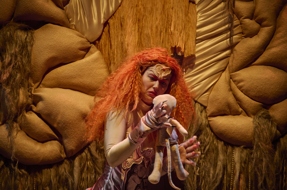 Diese Bühne gleicht einer Mischung aus Kinderspielplatz, Steinzeit-Höhle und Feenwald, auf der sich haufenweise Eierkartons und Eierschalen stapeln. In der Mitte befindet sich ein hoher Thron aus braunem Stoff mit langen Pelzsträhnen, an den Seiten hängen riesige Stoffzotteln an Perlen- und Metallketten von der Bühnendecke, irgendwas zwischen Bärenfell und Handtasche. Am Anfang noch recht ordentlich, verfällt die Bühne (von Sophie Lichtenberg) immer mehr ins Chaos, bis sie einem unaufgeräumten Kinderzimmer gleicht.