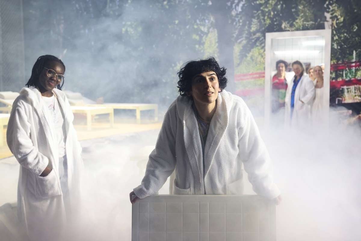 Zur Uraufführung von Patty Kim Hamiltons "Schmerz Camp" wird das Bremer Theater unter Regie von Christiane Pohle zur Kurklinik. Die medizinische Fachrichtung mag nicht so ganz klar sein, aber irgendwie ist das auch nur folgerichtig, weil es bei chronischen Schmerzen schließlich um ein genauso diffuses Krankheitsbild, an dem auch Ärzt:innen noch rätseln. Aber eine "Expertenklinik" ist es, eine "weltberühmte", um genau zu sein. Und für manche der seit Jahren chronisch schmerzgeplagten Patientinnen liegt hier die vielleicht letzte Hoffnung zwischen Massagen und Meditation, zwischen progressiver Muskelrelaxation und Kunsttherapie.