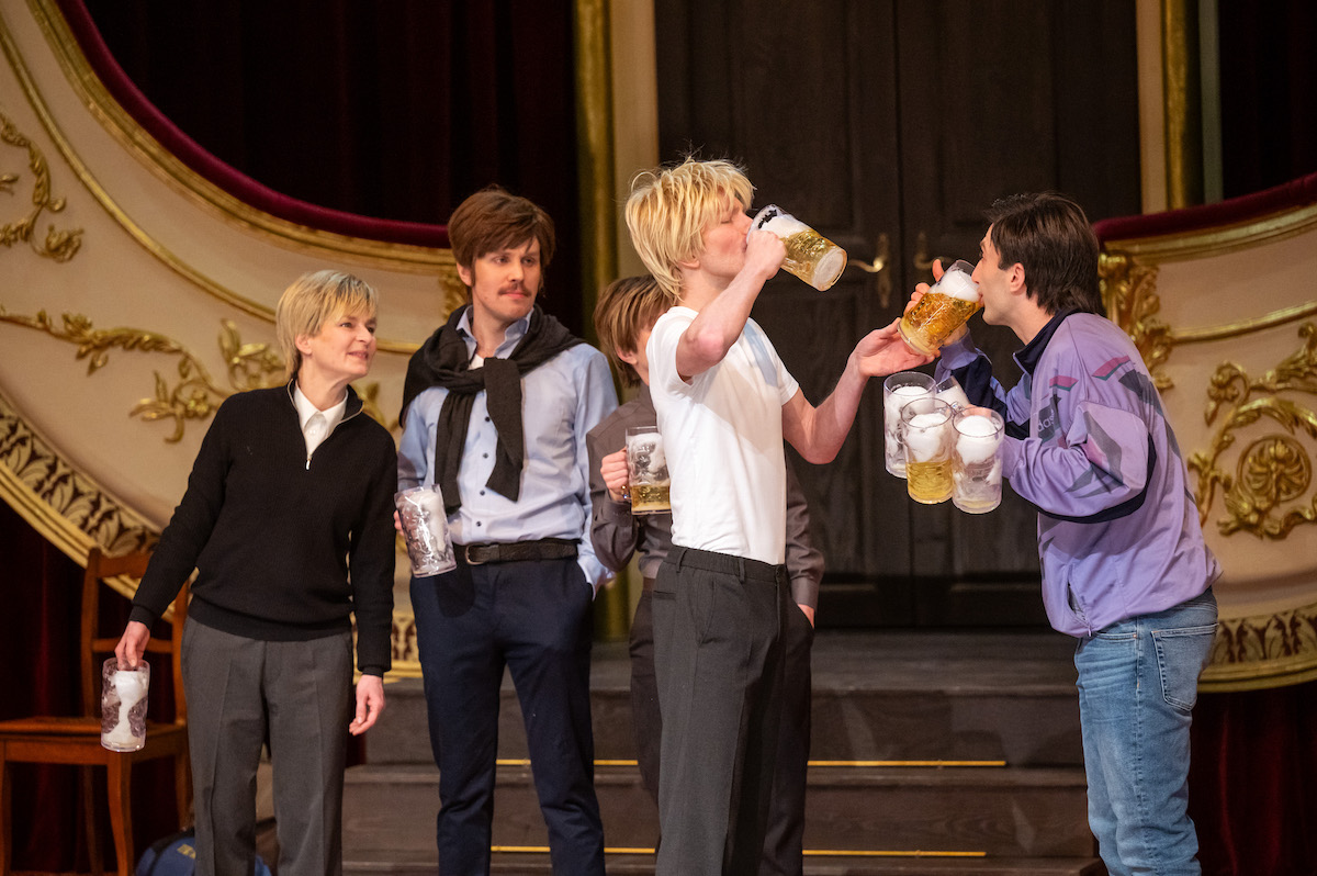 26. Januar 2025. Warum bestehen völkische und männerbündische Ideen auch in einer aufgeklärten Welt? Philipp Löhle widmet sich der Frage in "Das deutsche Haus" in Göttingen. Gewalt, sehr viel Bier und geschickte Diskursverschiebungen werden mit Horrorfilm-Ästhetik zu einer bemerkenswerten Groteske kombiniert.