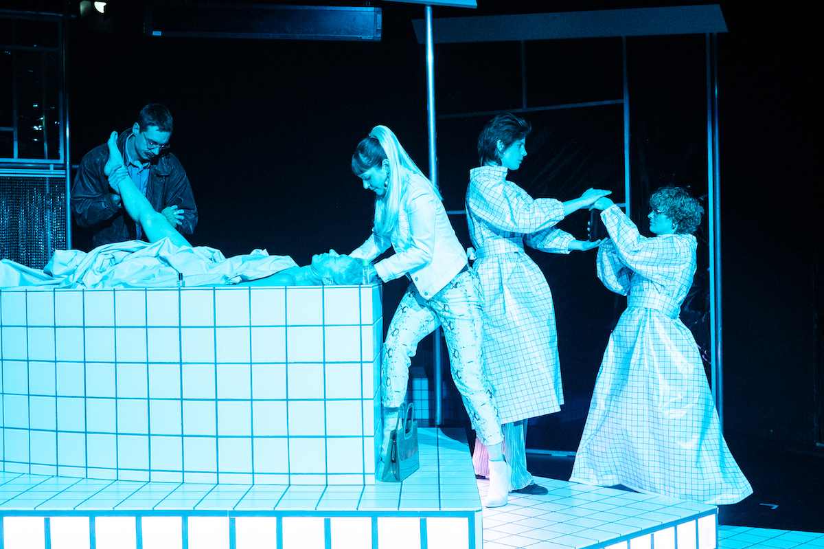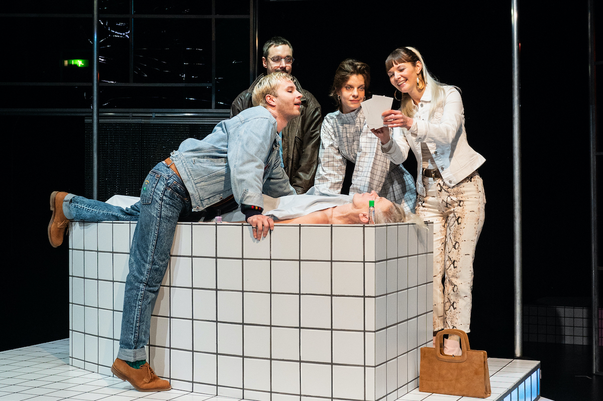 Vier Geschwister bei der Mutter im Leichenschauhaus: Roman Majewski, Inge Mathes, Nathalie Thiede, Yana Robin La Baume, Lou von Gündell in "Die Nacht als Laurier erwachte" © Anton Säckl