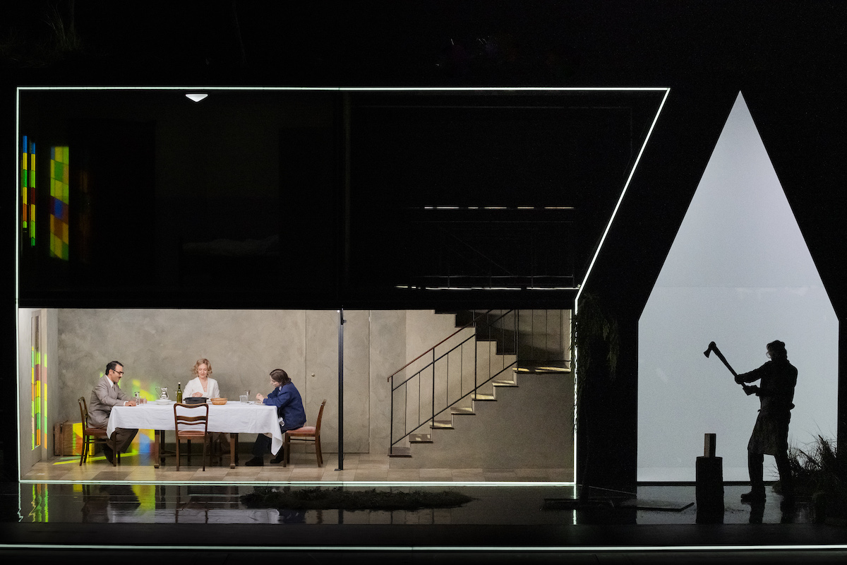 Das Bühnenbild von Irina Schicketanz lässt sich dabei nicht lumpen: Es gibt Neonquadrate, die in den Umbaupausen den Zuschauerraum taghell erleuchten, es gibt Bäume und staubige Gräser auf der Bühne, es gibt das Haus selbst, das immer wieder aus dem Bühnenboden hoch- und wieder herunterfährt, es gibt schwarze Gaze vor der Bühne, auf die mal eine Truppe Rotarmisten, mal die Geister vorangegangener Generationen des Hauses projiziert werden, ungesehen von den aktuellen Bewohner*innen.