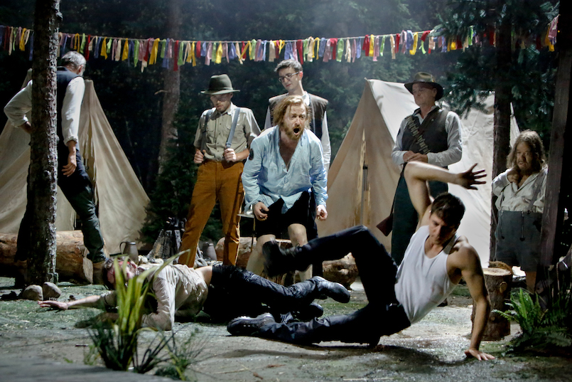 Mondtag verlegt als sein eigener Bühnenbildner die Geschichte in ein Zeltlager im Nadelwald, bei Mondschein, vorn der Teich, seitlich ein Jäger-Hochstand, das Ganze halb Pfadfinderidyll, halb Prepper-Camp. Der Hauptmann (Martin Rentzsch) streift mit einem Jagdgewehr herbei und lädt es seelenruhig durch, wenn er über die Ewigkeit, die zum Augenblick gerinnt, sinniert. Der Doktor (Marc Oliver Schulze) maßregelt seinen Probanden und bittet ihn dann fast zärtlich zur Urinprobe. Der Tambourmajor (Max Gindorff) glänzt als sportiver Eigenbrödler, schwenkt einmal eine Fahne, deren Dreiecks-Symbol nach identitärer Bewegung ausschaut, und vermöbelt plötzlich brutal den eifersüchtigen Rivalen Woyzeck, grunzend: "Ich ficke ein Loch in die Natur!"