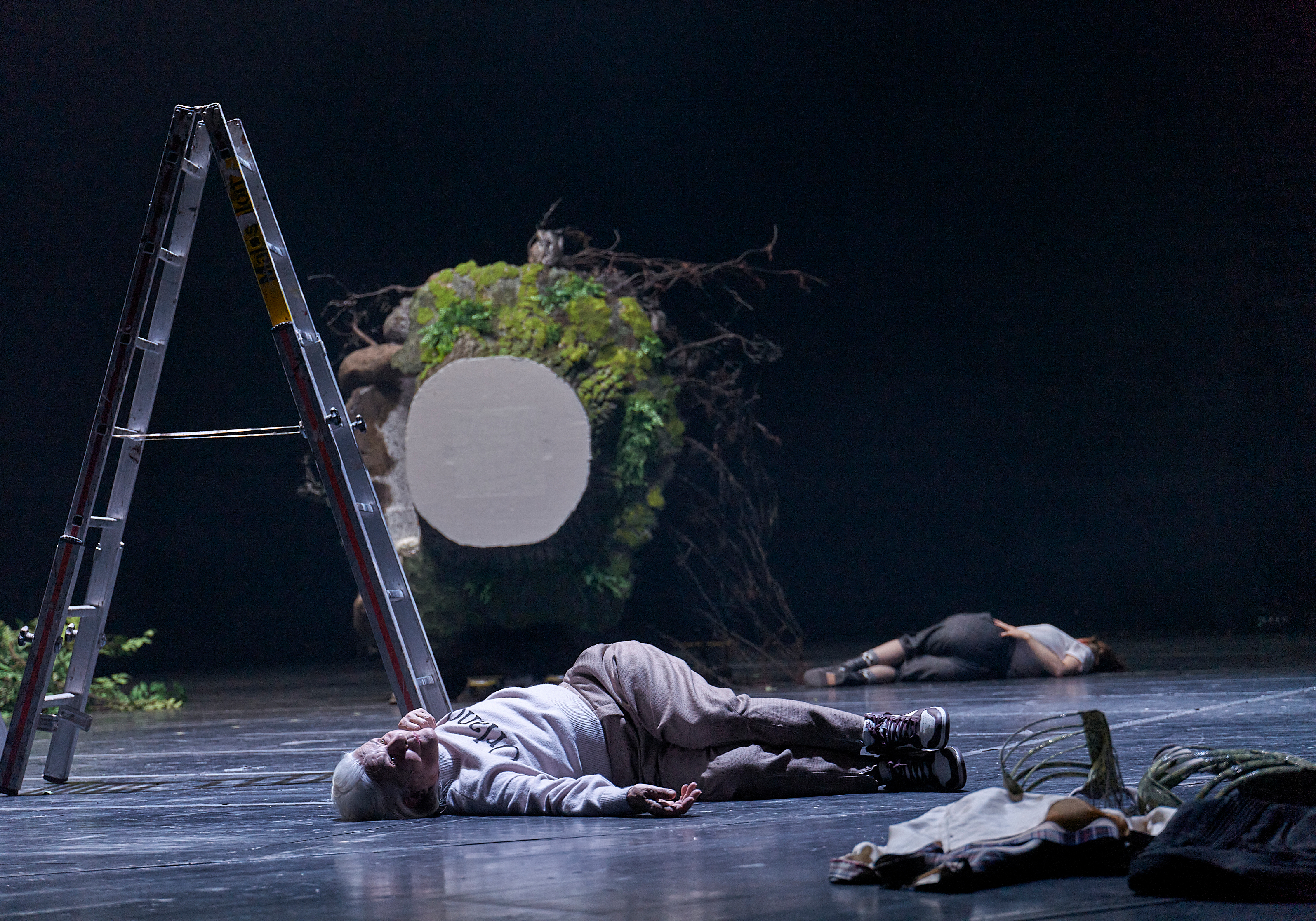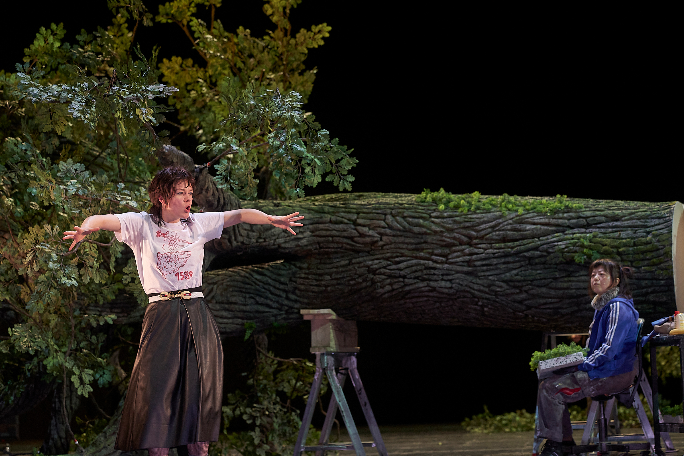 Dafür wird permanent an einem riesigen, quer liegenden knorrigen Eichenbaum gewerkelt, geschraubt und geklebt. Lars Rudolph und Sachiko Hara schleppen immer neue Äste heran, ganze Paletten von Moos und anderem Grünzeug und sorgen dafür, dass das künstliche Stück Natur im Hintergrund lange immer weiter wächst, während vorne in der Geschichte eine britische Gesellschaft die nächste ablöst, von Elisabeth I. im 16. Jahrhundert bis ins Viktorianische Zeitalter und darüber hinaus.