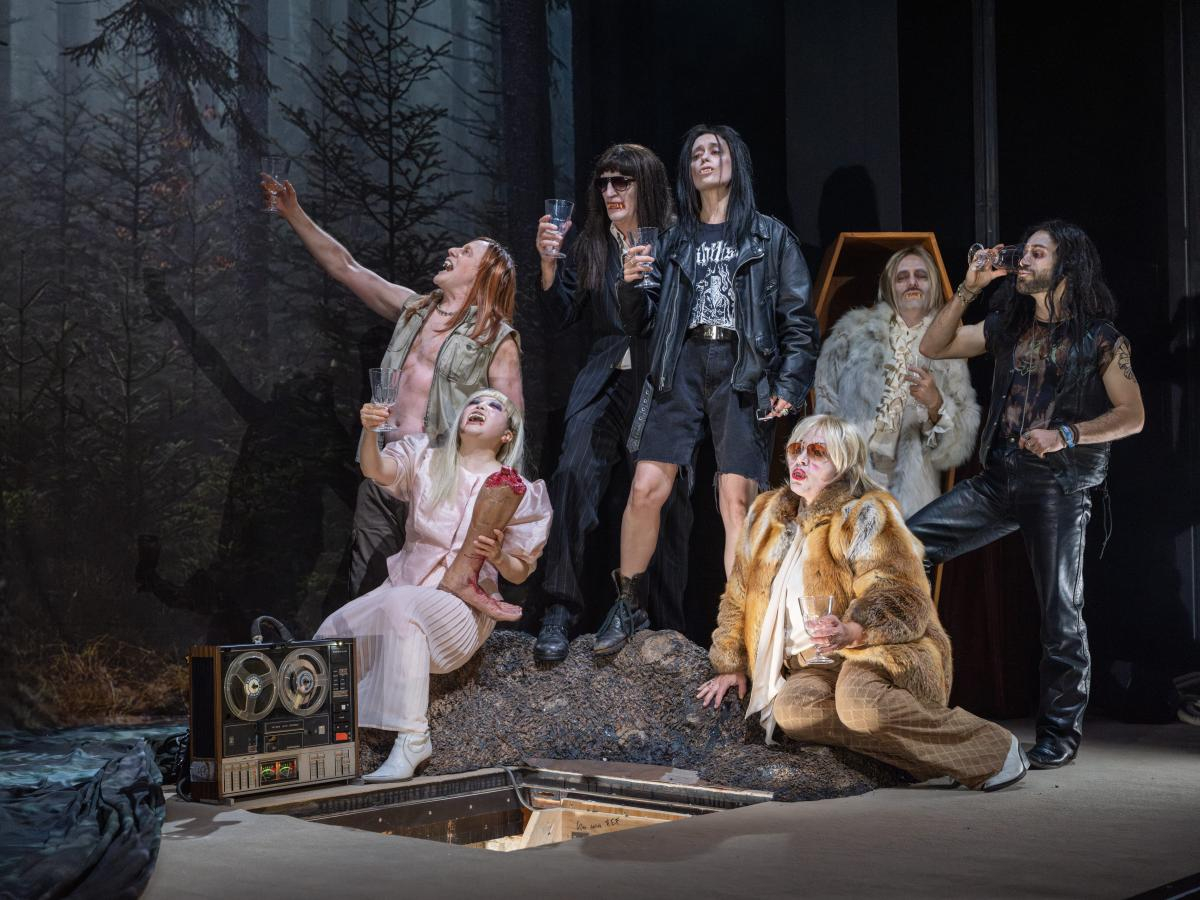 17. Oktober 2025. Reichlich Nebel. Eiskalte Chöre. Der Vorhang hebt sich, dahinter ist eine große Plane mit einem Fichtenwald darauf gespannt – ein Fichtenwald, in dem die eine oder andere Hexe unvorsichtigen Kindern auflauern könnte. Hier ist es allerdings ein Sarg, der aus der Bühnenversenkung gewuchtet wird. Er enthält einen kleineren Sarg. Ein paar der Schauspieler*innen setzen sich darauf, die anderen beginnen, mit dem großen Sarg zu spielen, mit langen Zähnen, noch mehr Nebel und Saallichtblitzen spielen sie Vampir.