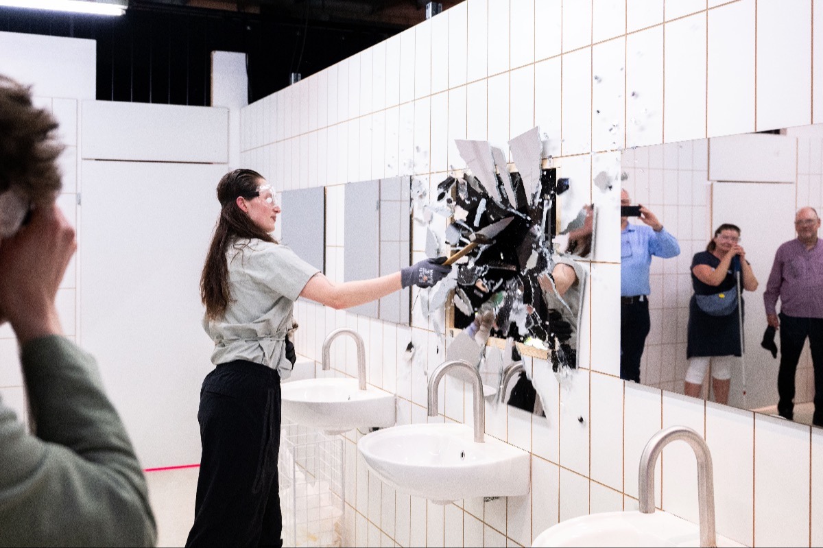 17. April 2026. Der Sanitärbereich im Hamburger Produktionshaus Kampnagel wurde erweitert. In der Halle K4 sind Toiletten aufgebaut, individuell gestaltet, aber ohne Türen, dazu ein großzügiger Vorraum mit Waschbecken und Spiegeln. Sowie mit einem Gang, der hinter die Spiegel führt, in eine dunkle Kammer, aus der man heimlich das Geschehen beobachten kann.