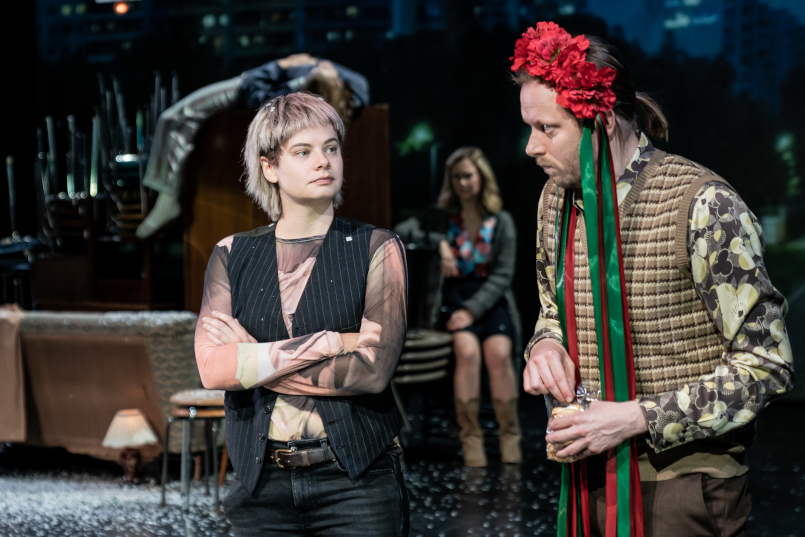 Im Nachgespräch mit dem kompletten Ensemble und der Dramaturgin erfuhren wir, dass sich das Team dagegen entschied, auf die aktuelleren Entwicklungen einzugehen. Die Stückfassung endet wie der Roman 2017. Konflikte gab es zwischen der deutsch-ukrainischen Live-Musikerin Masha Kashyna und dem Regisseur auszufechten: sie pochte darauf, dass als Songs, die in Mican-Arbeiten immer eine wesentliche Rolle spielen und die Atmosphäre seiner karg ausgestatteten Abende entscheidend prägen, nicht nur nostalgische, russische Lieder aus Sowjetzeiten, sondern auch ukrainische Lieder ausgewählt werden.