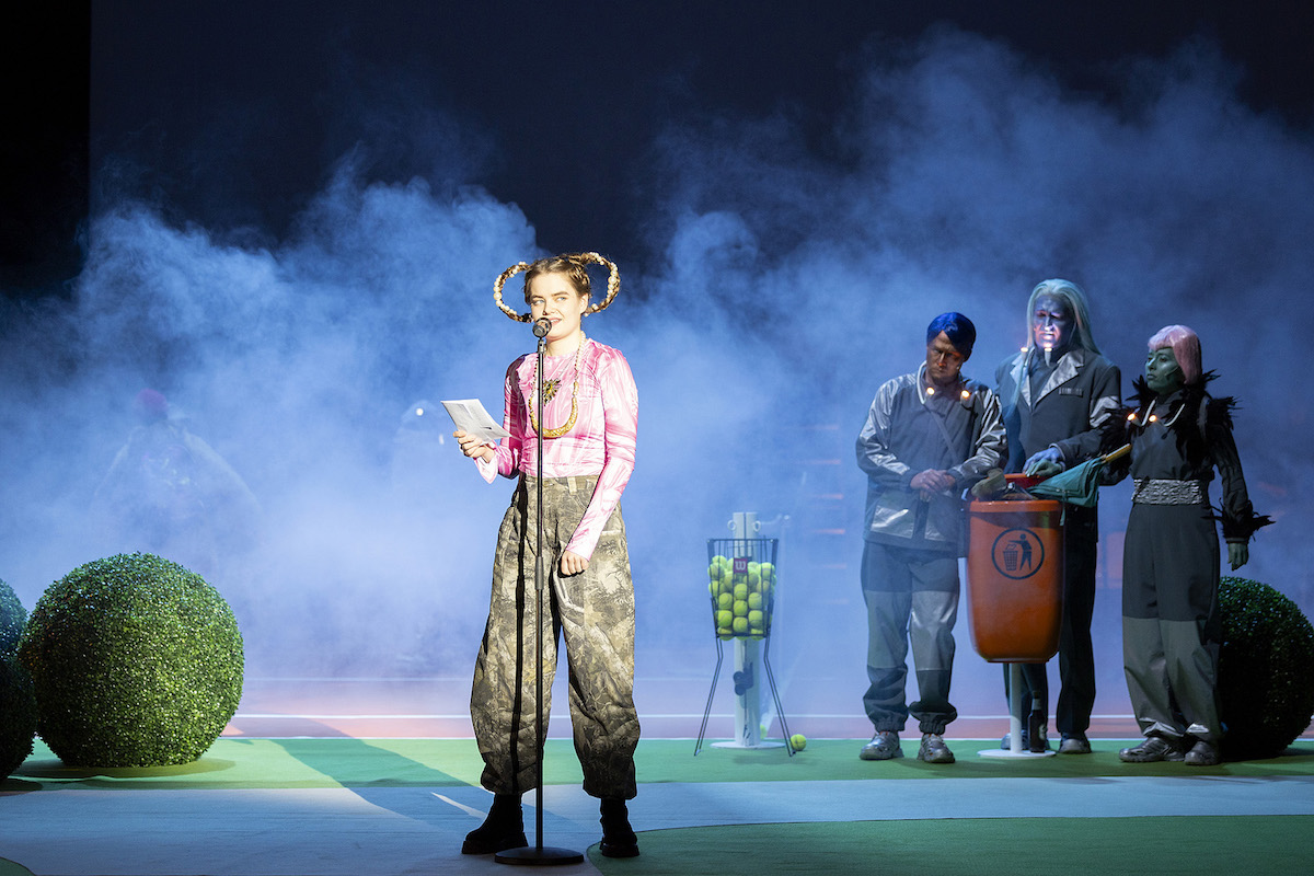 Bis der Abend dann doch noch eine fiese Falle baut. In einer bedrückenden Szene nämlich wird eine Schülerin (Noa Frank) von der Autorität gefoltert, und zwar mit Musik: Bata Illic, Andreas Gabalier, "Schleswig-Holstein, meerumschlungen". Das hält niemand aus – nach so einer Behandlung ist das Opfer auf Linie und nur noch für rhythmische Sportgymnastik zu gebrauchen.