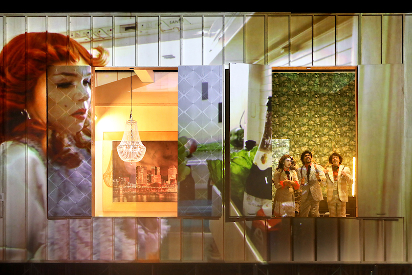 Wie meist arbeitet Bauer mit Live-Kamera, die fängt hier ein, was im Inneren des Containers geschieht und projiziert es auf eine Außenwand. Dort sehen wir, wie Putzfrau Tatti (Philipp Alexej Voigtländer) das Klo schrubbt und die echte Souffleuse Christine Schneider in der Ecke sitzt und im Text blättert. Der Container verfügt über ein großes Fenster, eine Veranda und eine Dachterrasse, und die Figuren laufen von hier nach dort und glotzen und grimassieren hemmungslos direkt in die Kamera. Katharina Linder gern mit eingefrorenem Staunen im Gesicht, Andreas Vögler herrlich eckig blasiert, Mark Tumba toll werbelächelnd, Lotte Schubert mit aufgerissenem Augenaufschlag. Dazwischen brilliert der begnadete Quatschmacher Fridolin Sandmeyer in Rollen aller Art.